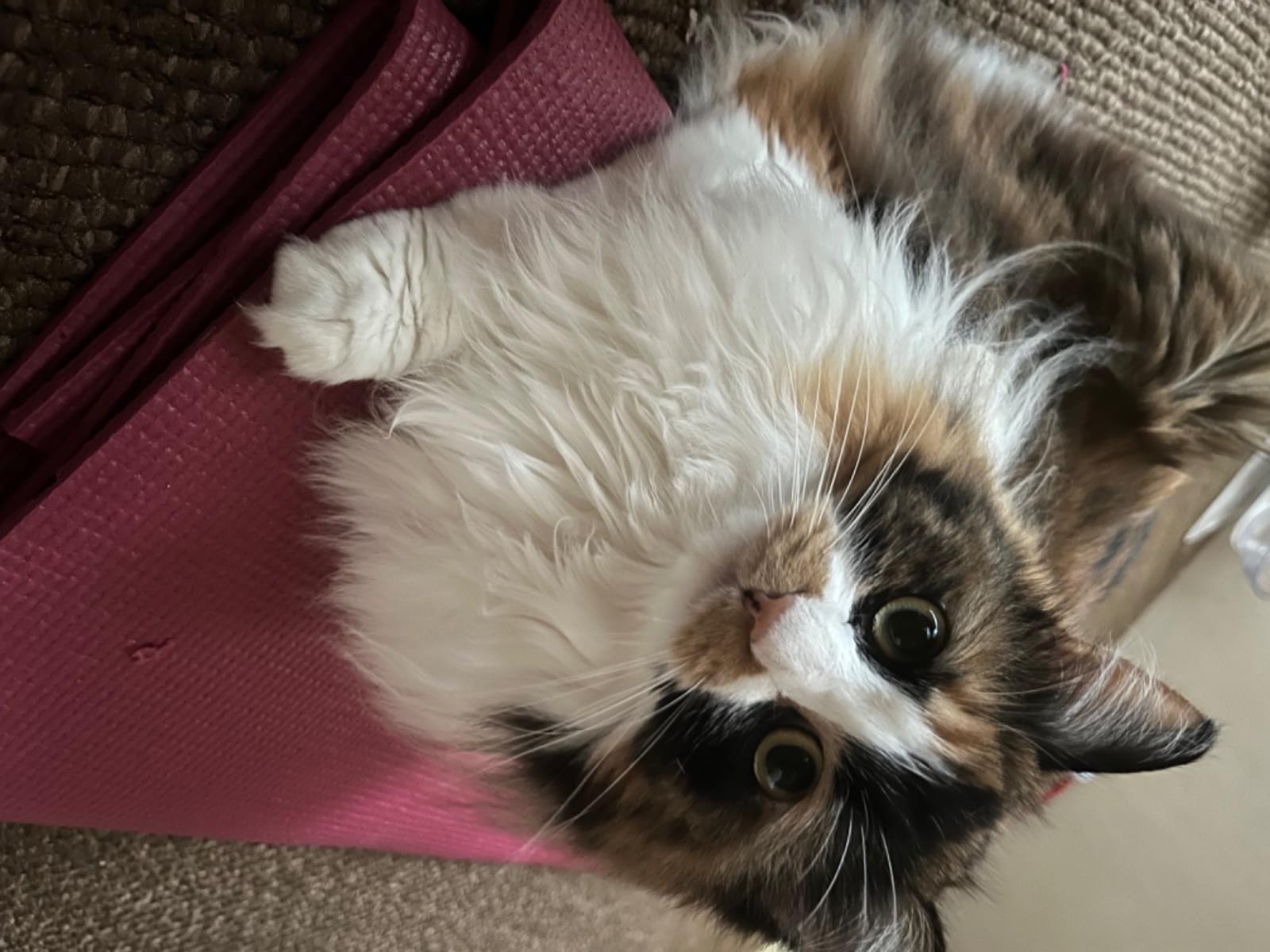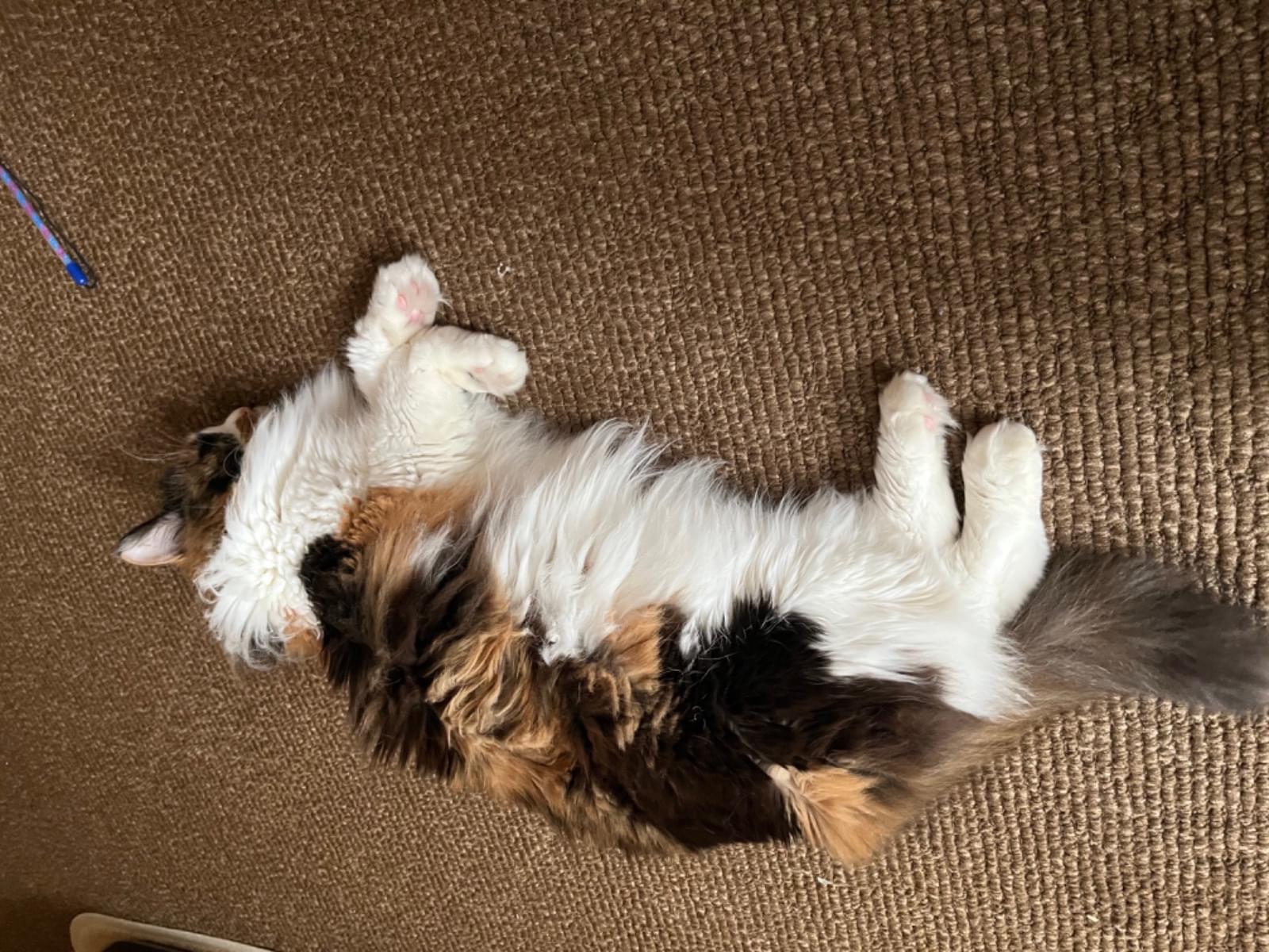 長毛の三毛猫で 顔はハチワレの少し大きめの猫です