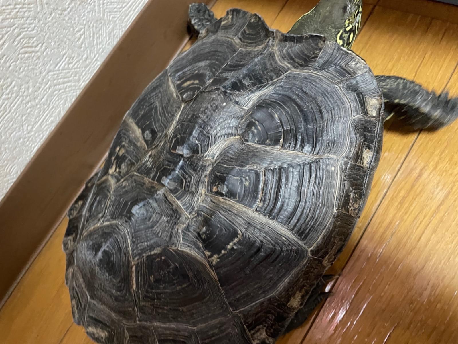 甲長20cm、甲羅の真ん中に凹みがあります。ご飯はピンセットから食べ、とても人懐っこいです。