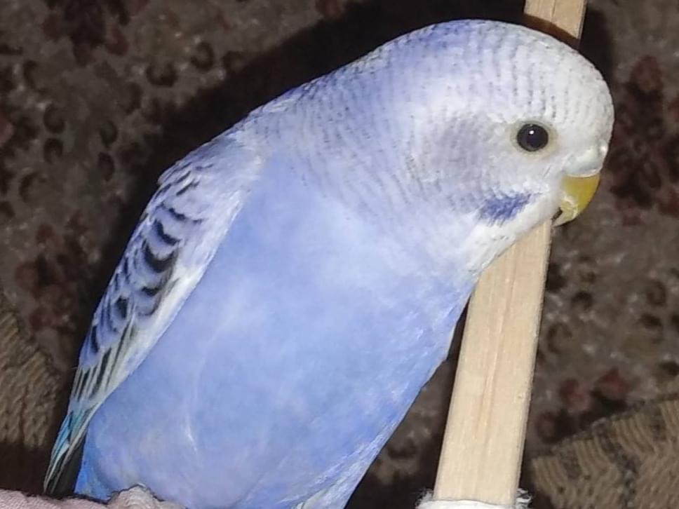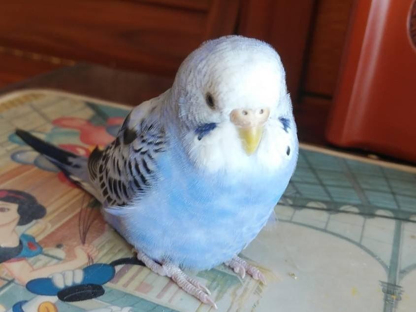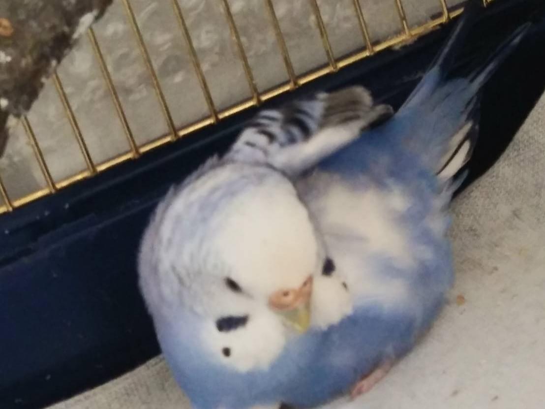 頭部は白っぽく、胴体は青、左右のほっぺに黒い模様と点があります。しっぽは青と紺ぽい(濃いめの青の色)の羽両方です。