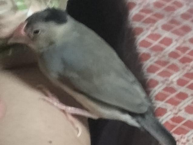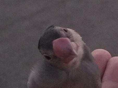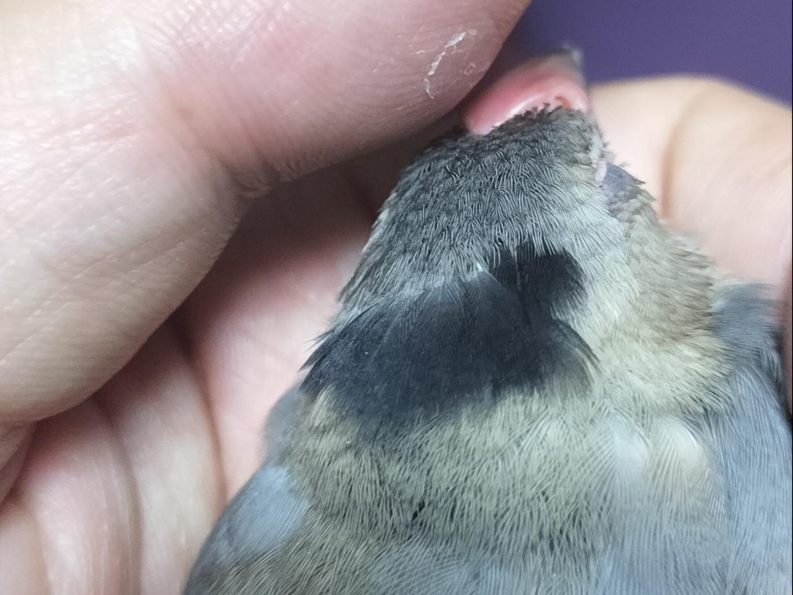 まだ桜文鳥の子供なので、色の出始めで全体は灰色、頭のてっぺんの毛だけ黒くなり始めています