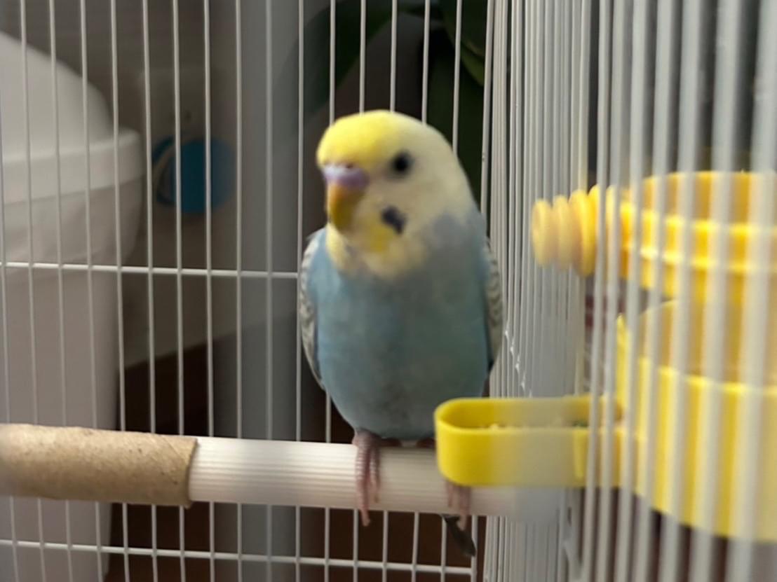 頭部と頬が黄色、体は青と水色、羽はグレー