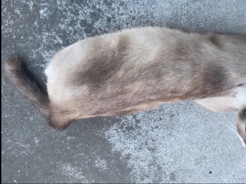 首輪は付けていませんが、首元が二箇所ほど円形脱毛のようにハゲてしまっています。お乳の感じからして、もしかしたら子猫を産んだのかな?尻尾はしっかりと長いです。