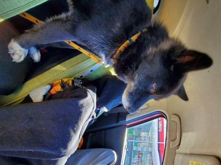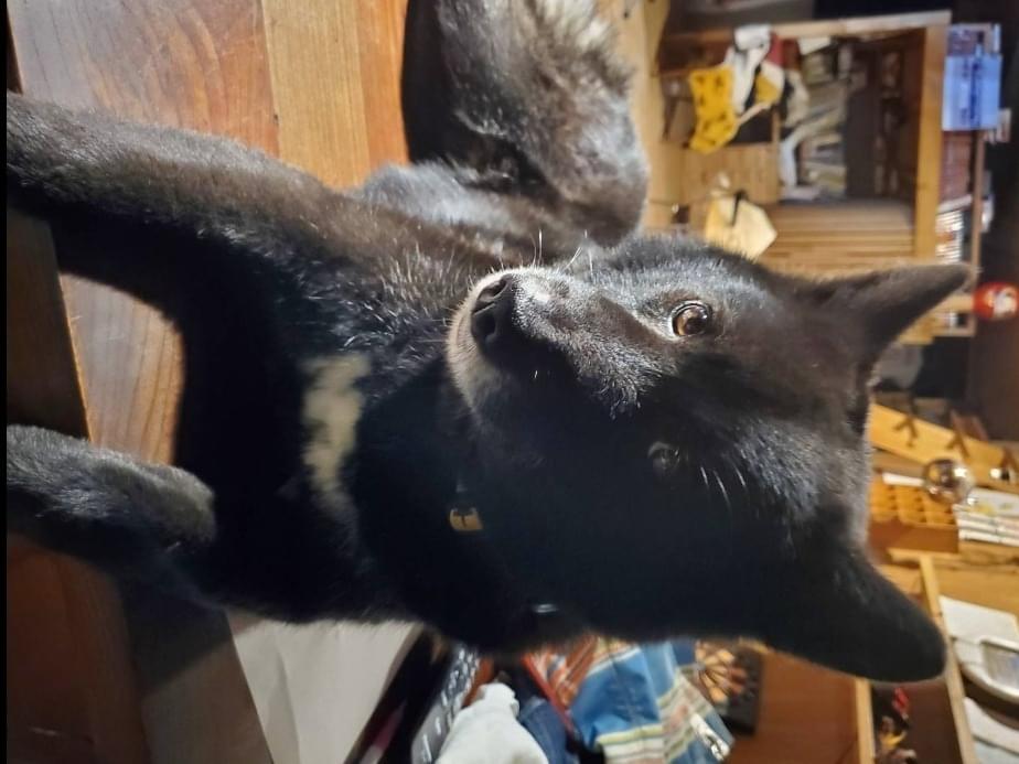 迷子!黒いミックス中型犬で口先、手足の先、胸元が白い。
