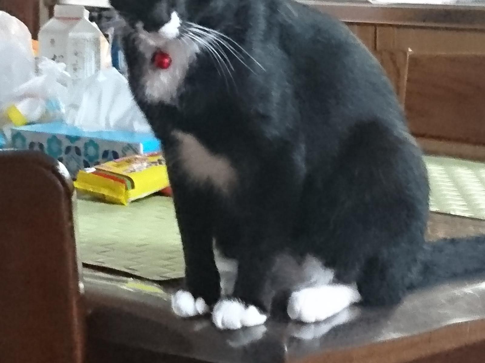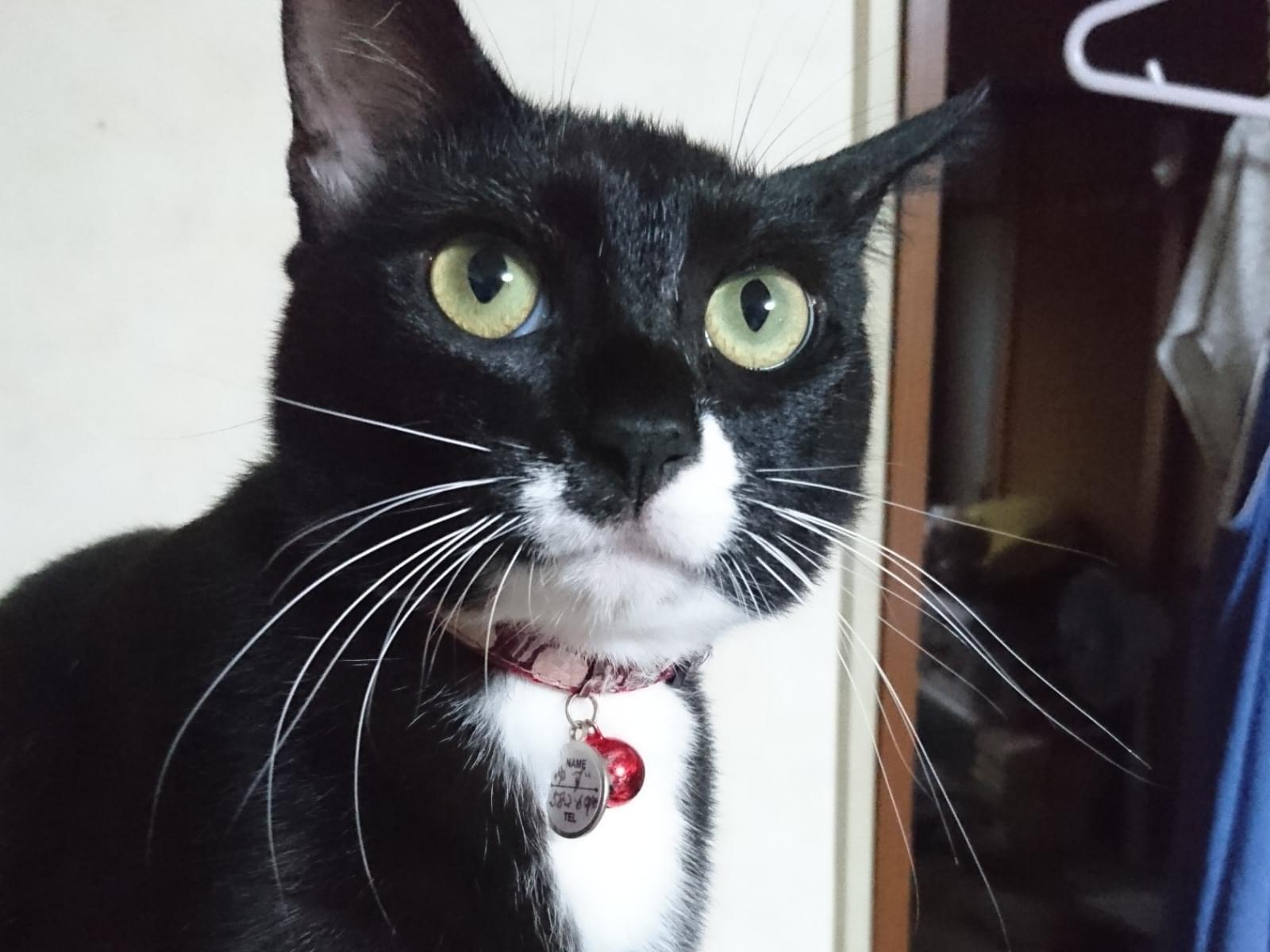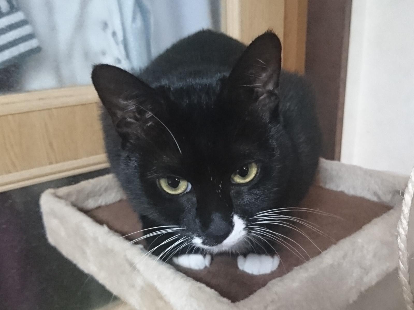 ほとんど黒色で口回りとお腹、手足が白い猫です。