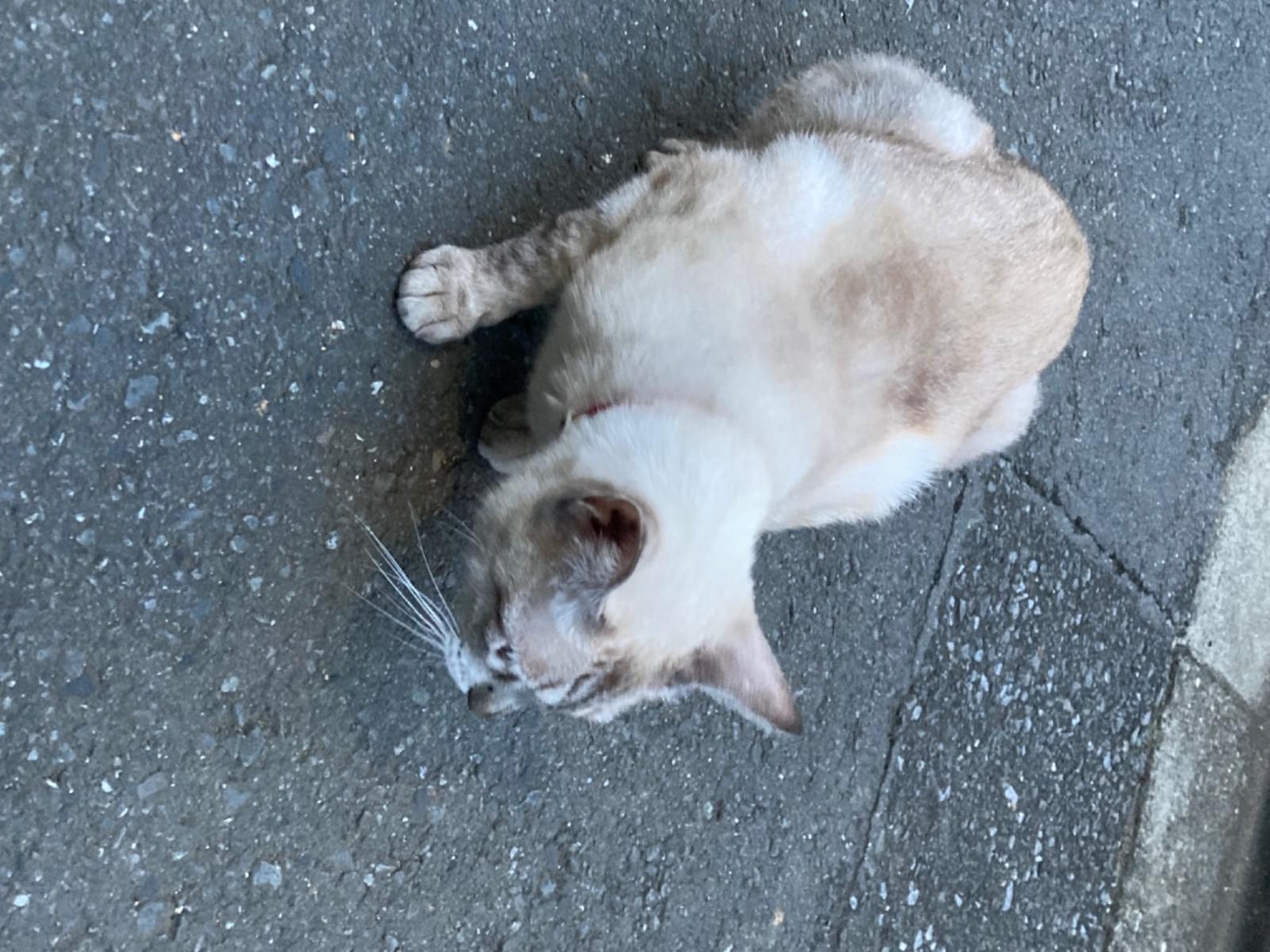 赤に白の猫ちゃん柄?の首輪を付け、水色の綺麗なおめめをした白っぽい茶色の猫ちゃんを見かけました。人を見ると寄ってきて、にゃーにゃー鳴いていました。道の真ん中でゴロンと寝転んでお腹をみせるなど、優しくて警戒心の薄い猫ちゃんのようです。近くにこの猫ちゃんのご家族が見当たらなかったため、迷い猫ちゃんかな?と思います。添付画像が上手く撮れておりませんが、この情報が何かのお役に立てれば幸いです。
