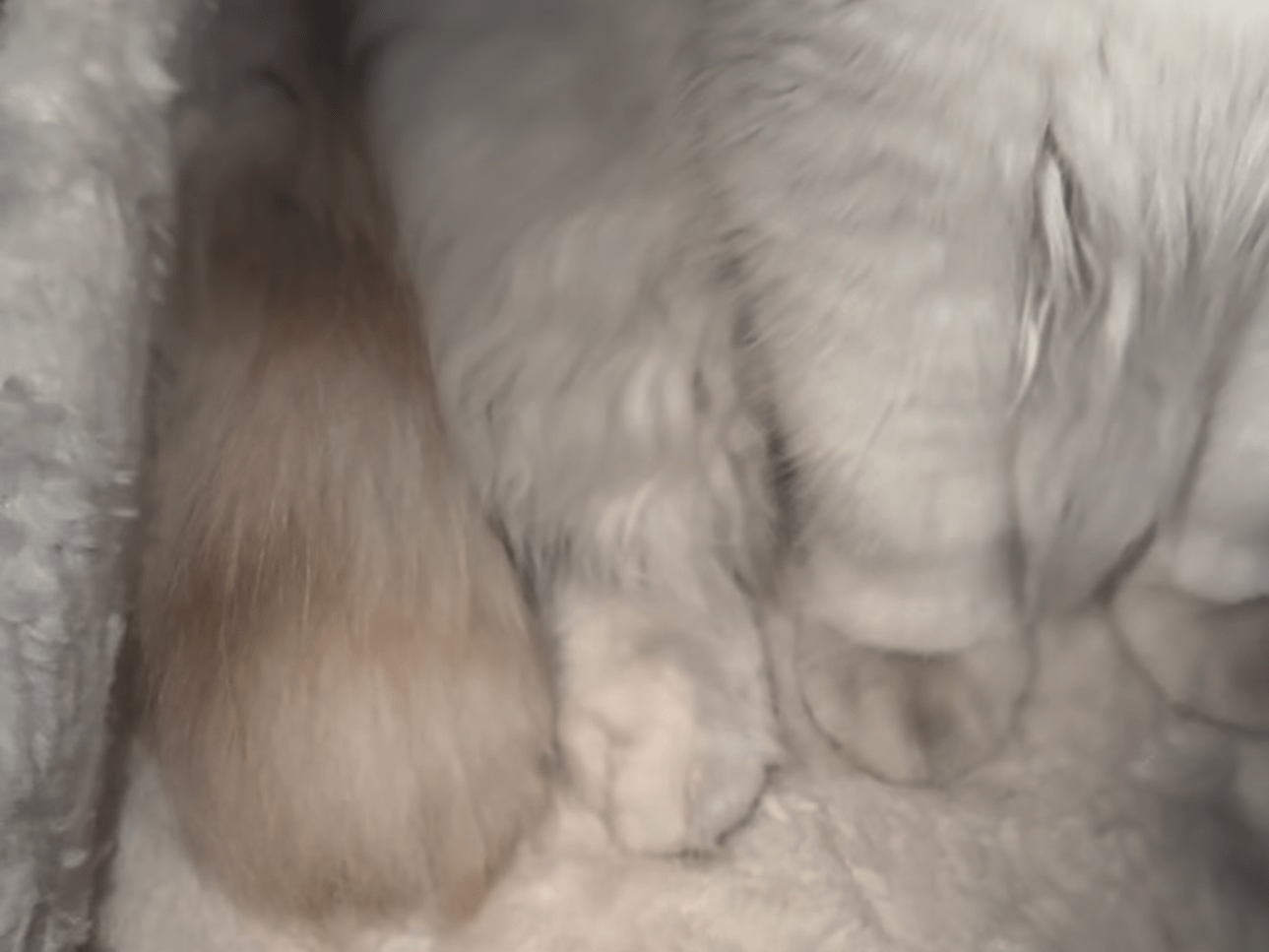 体はほぼ白で背中に少し茶色の毛があり、しっぽは白と茶のしましまで、中毛~長毛っぽい恐らくオスの猫ちゃんです。