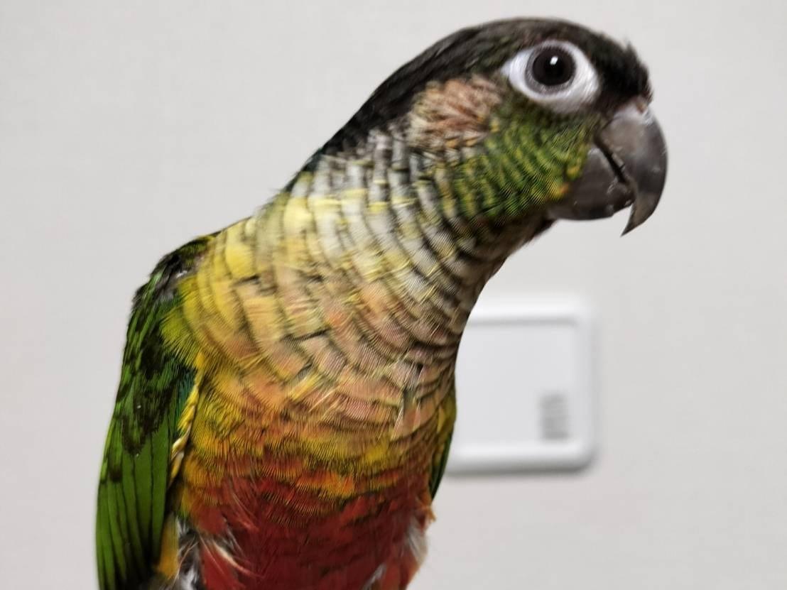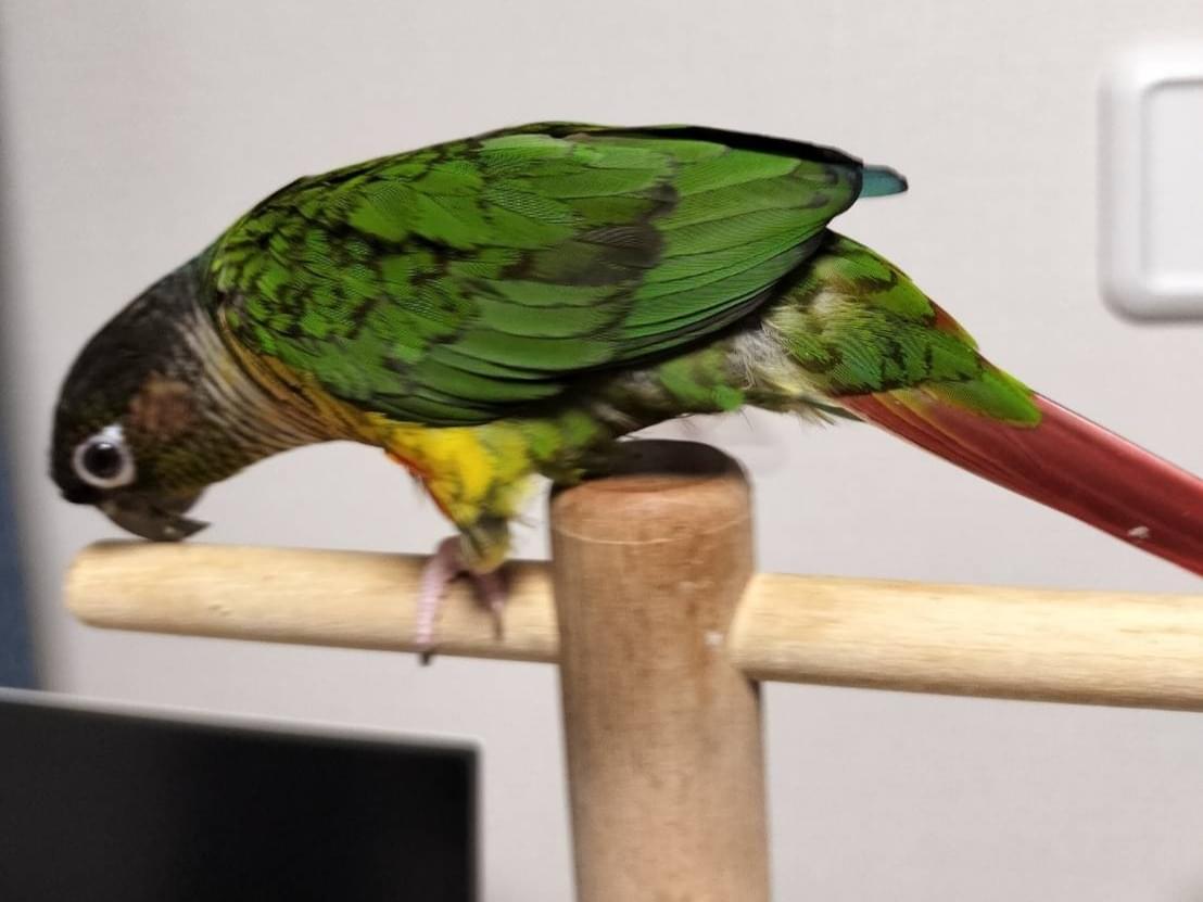 放鳥中に窓から逃げてしまいました。右足に足輪がついています。「くるみちゃん」「おはよう」「行ってくるね」などの言葉を少し話します。