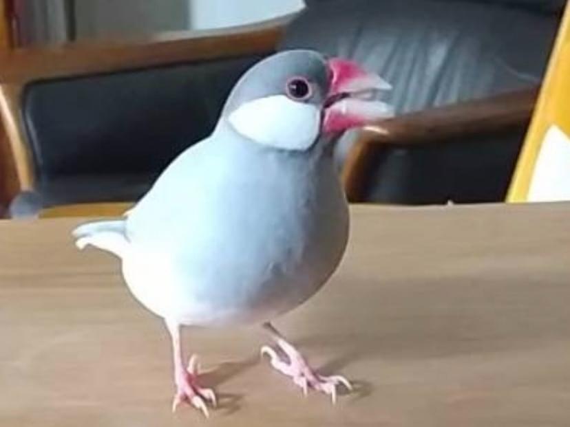 くちばしが赤く頬が白いグレーの文鳥です
