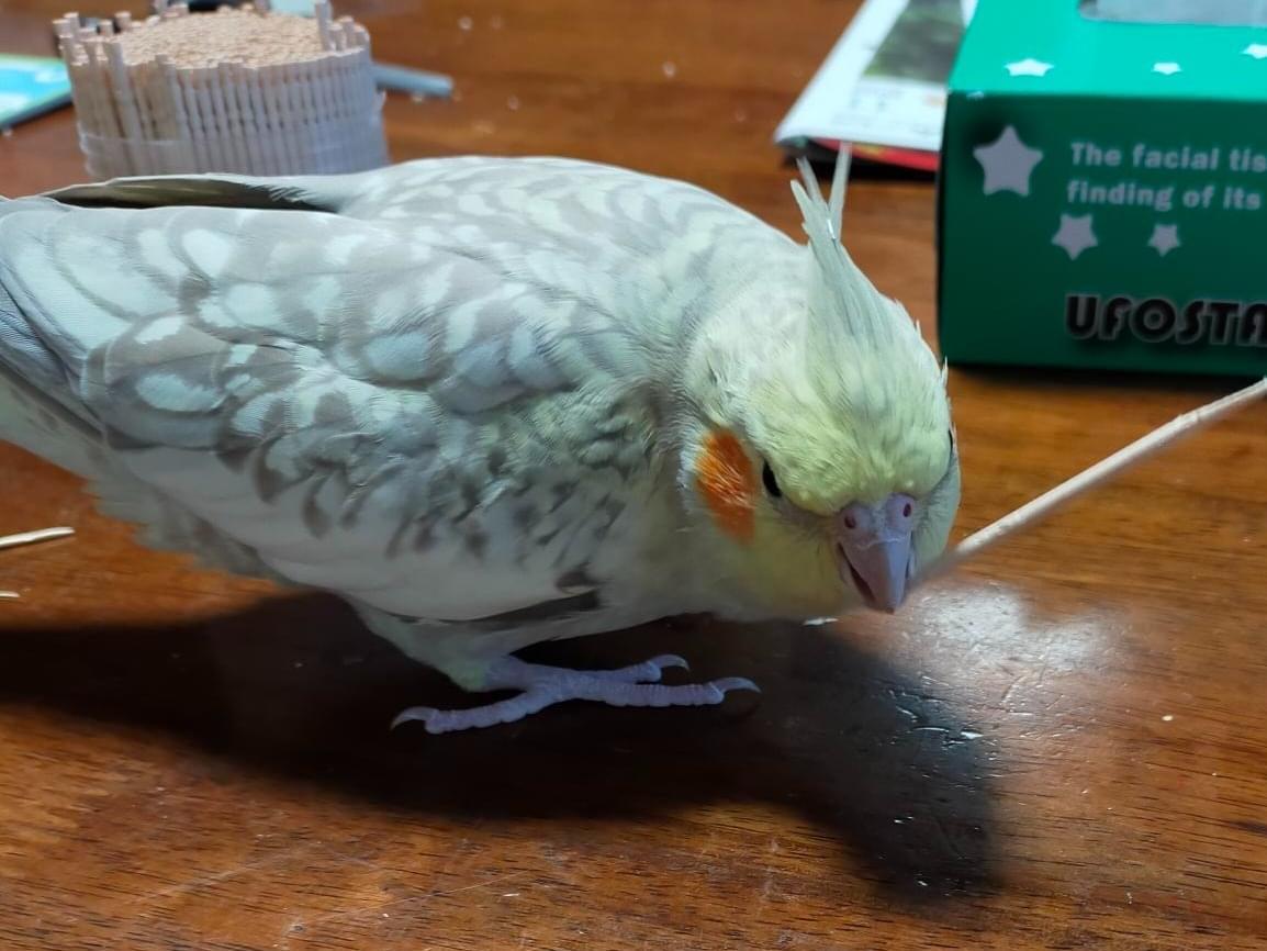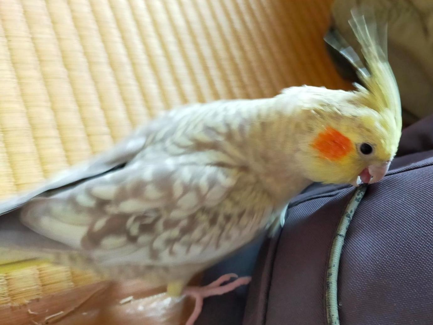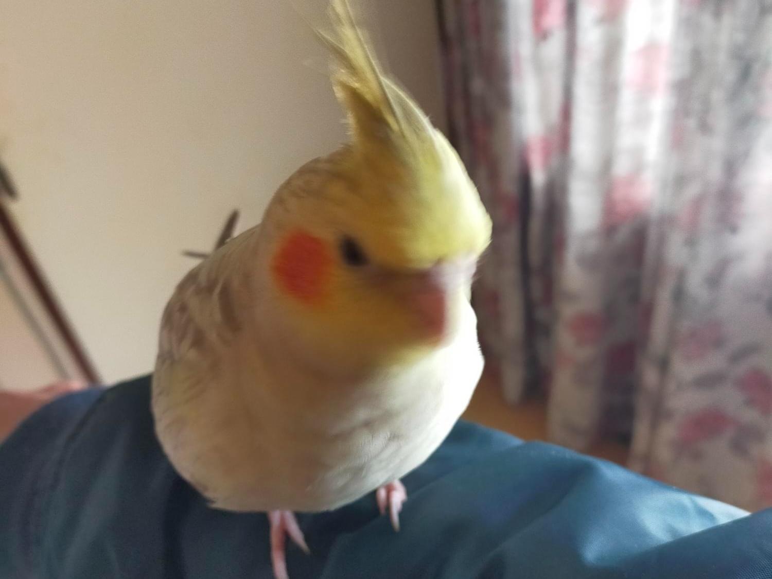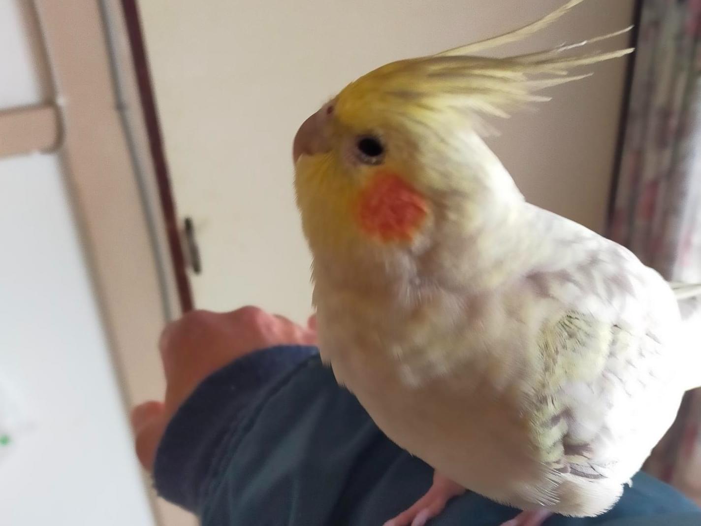 オカメインコのシナモンです。名前はフウタ。よく人なれしていますが迷い鳥状態では寄ってくるかどうかはわかりません。ひまわりの種をよく食べていました。色は黄色をベースとしたグレーが混じった羽色です。