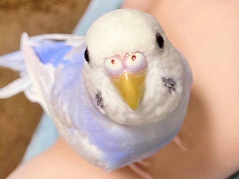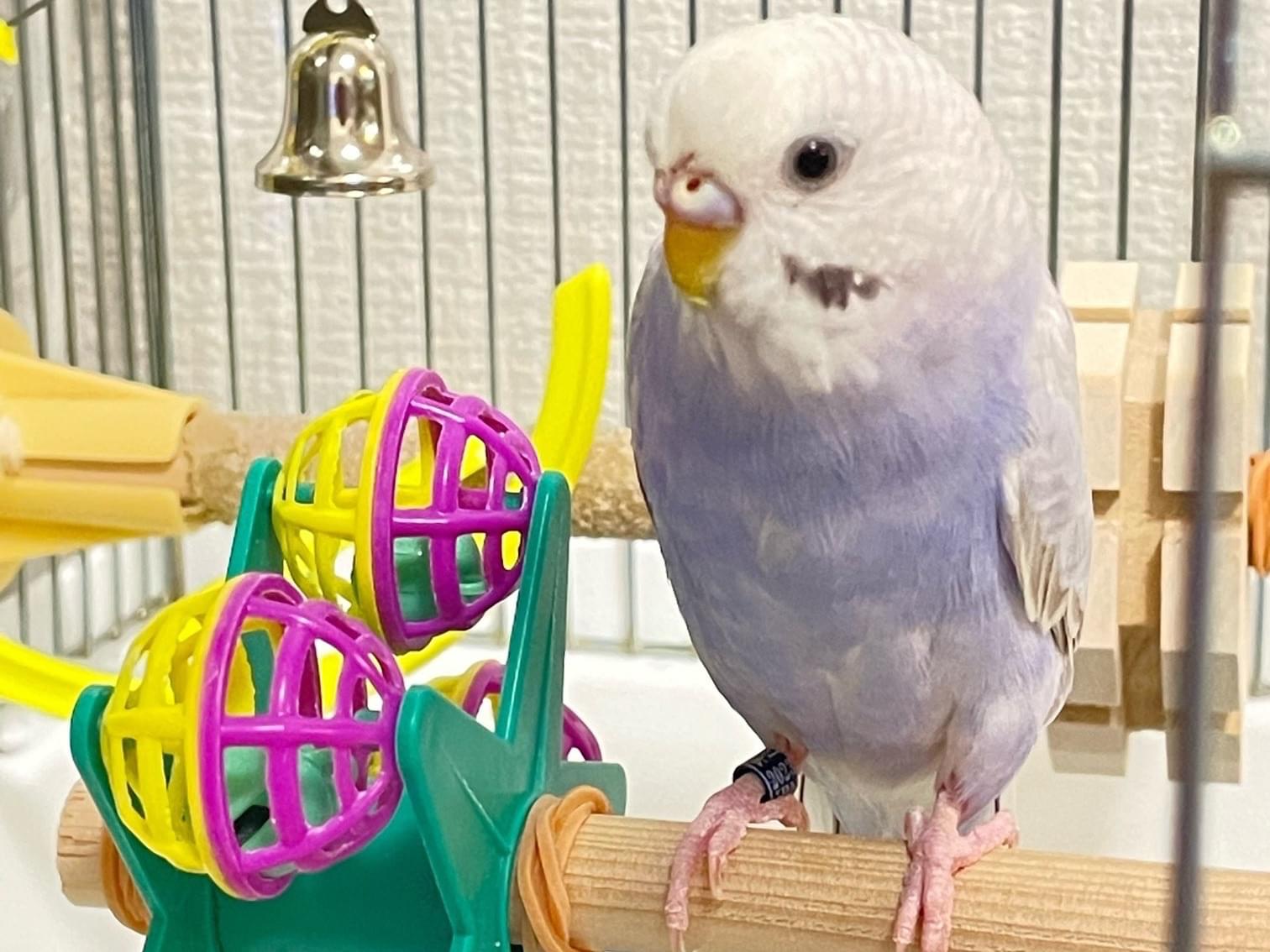 白に背中と尾っぽがブルー、翼が薄いグレーのセキセイインコです。青い足環を付けています。