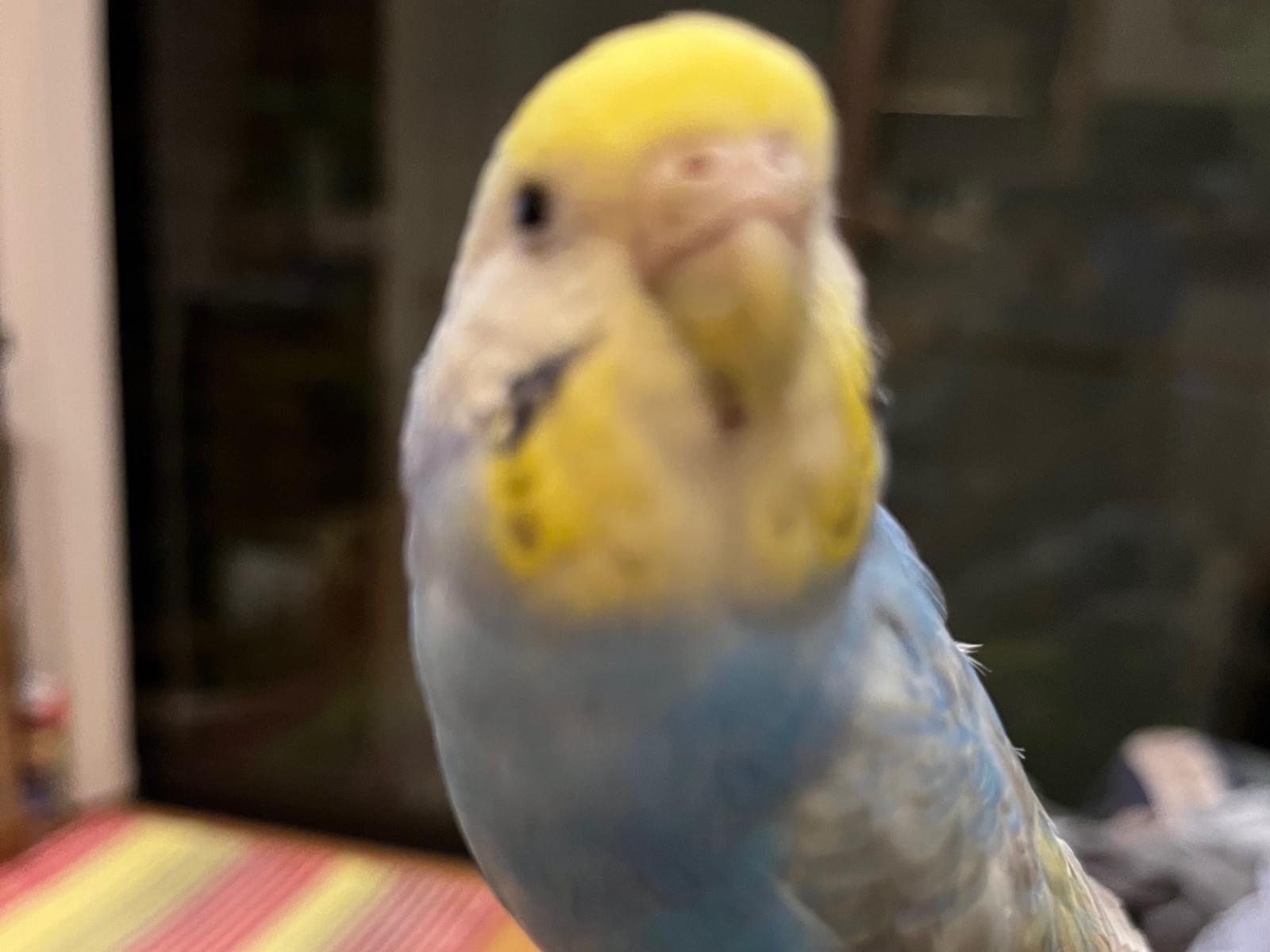 インコのポポちゃんが家から出ました。青い羽で頭が黄色です。