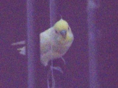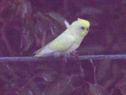 セキセイインコだそうです。真っ白に見えましたが黄色い羽に写ってました。ムクドリのねぐら入りを眺めていたら見つけました。朝5:30ごろ。日の出前に気がつき、6:00位にはムクドリと一緒に飛んでゆきました。迷い鳥かと思われます。