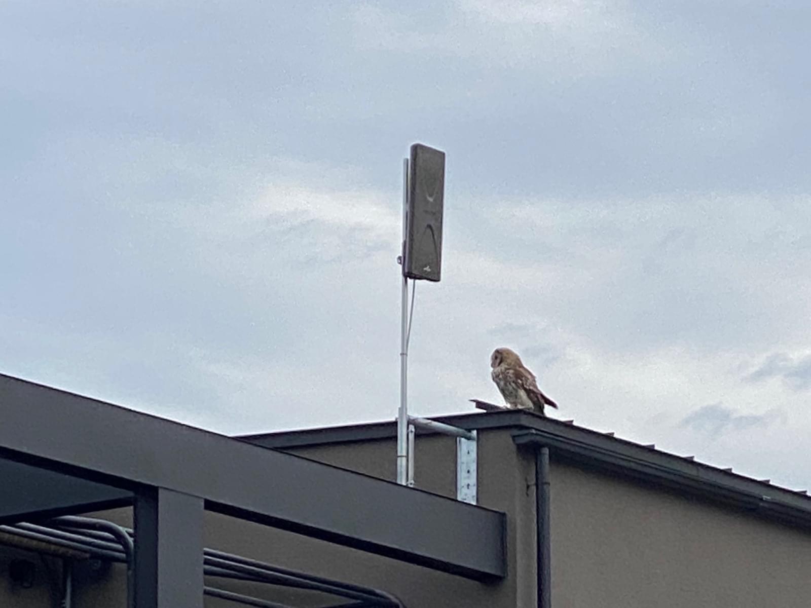 近くにいた方がこのフクロウはカラスに囲まれていたところ、飛んで逃げてこの建物の上にとまったと仰っていました。