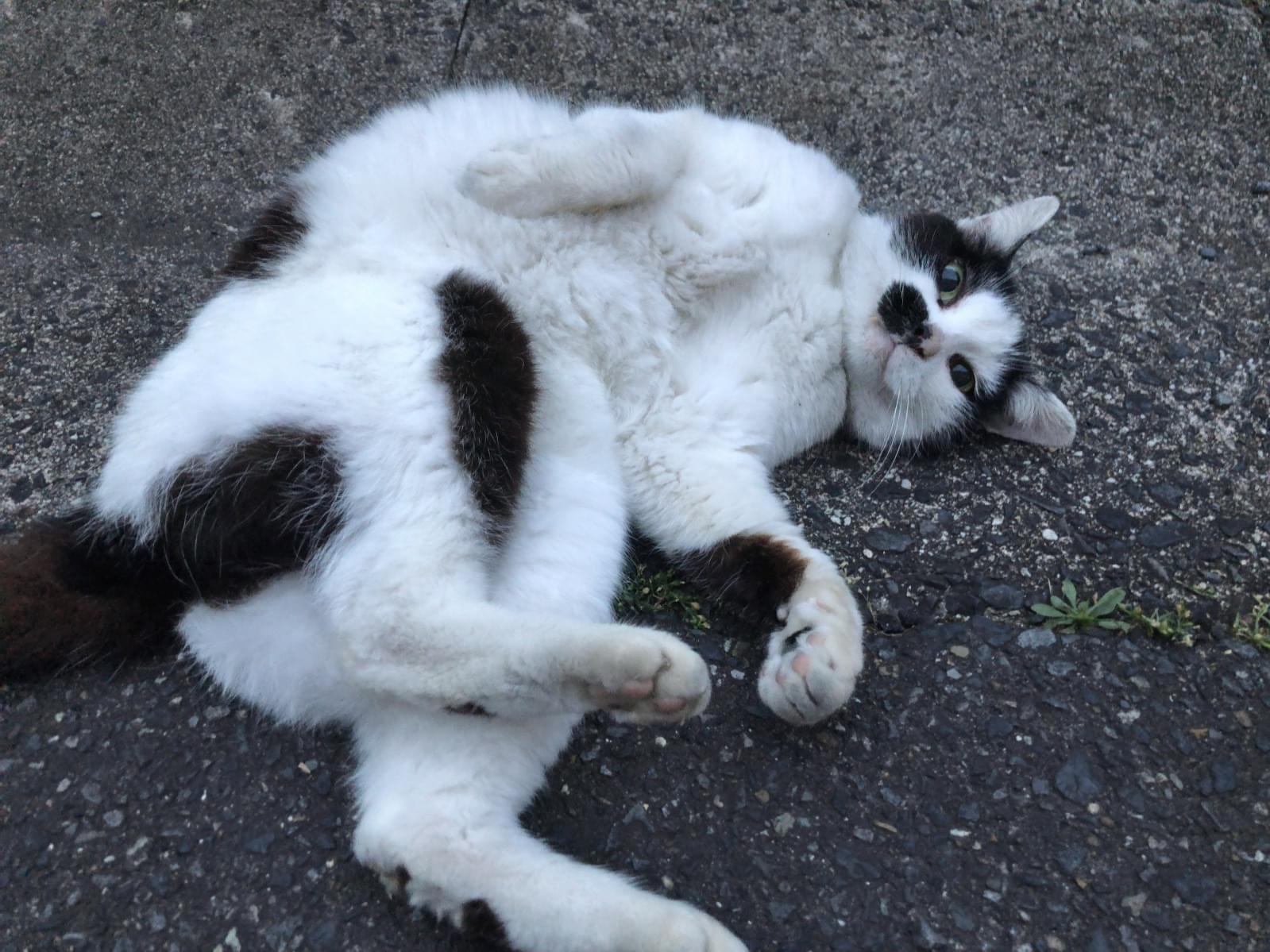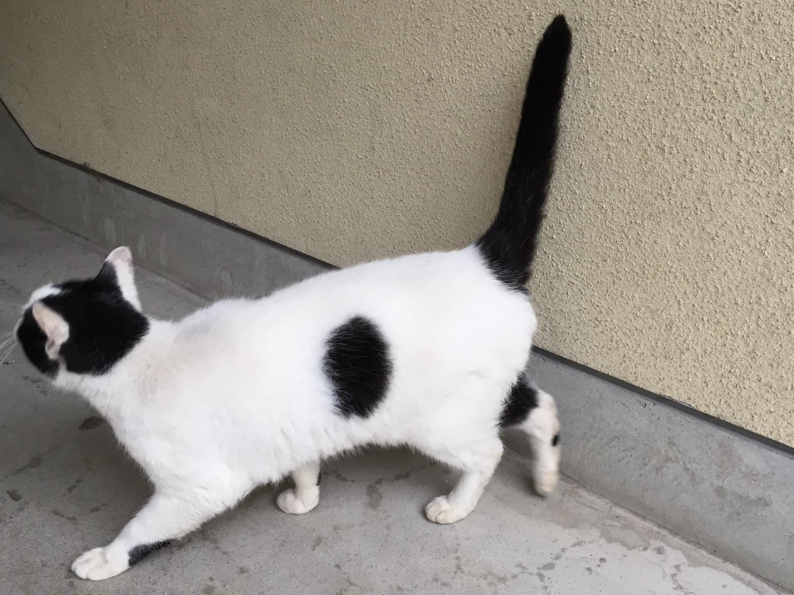 白地のハチワレです。体の右に黒の斑点2つ、左に黒の斑点1つ。