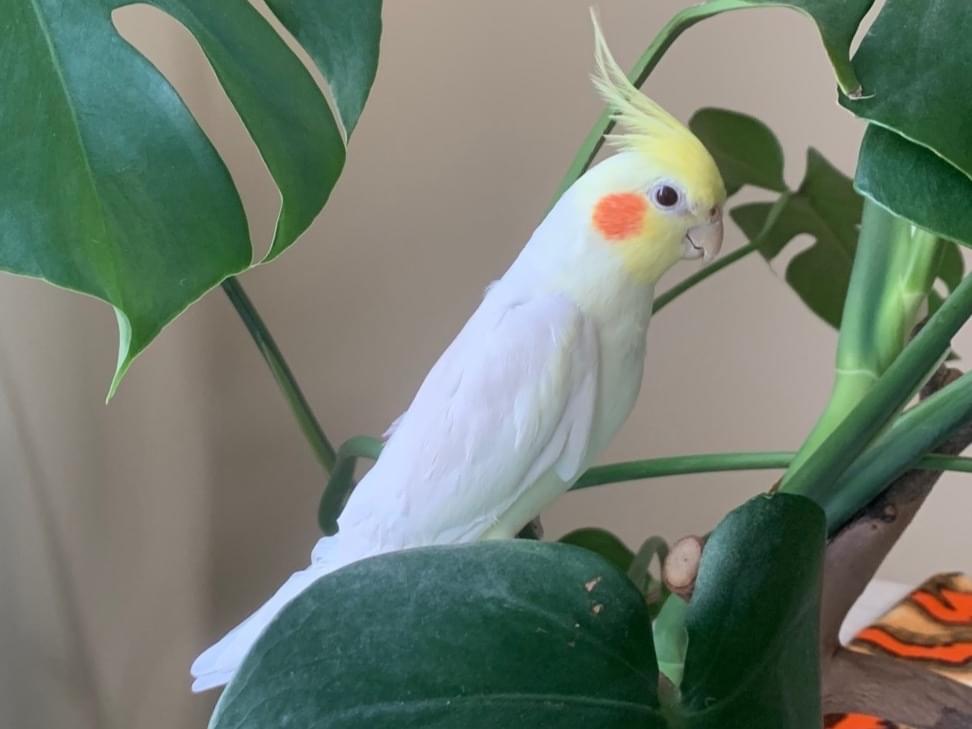 体は、黄身がかった白色で、顔と冠羽は黄色です。ほっぺも大きめにオレンジのチークが入っています。チコちゃんと呼ぶと返事をして、「チコちゃんかわいいね」とお話しします。「ホーホケキョ」「コケコッコー」や口笛の真似もします。人慣れしていますが、臆病な性格です。