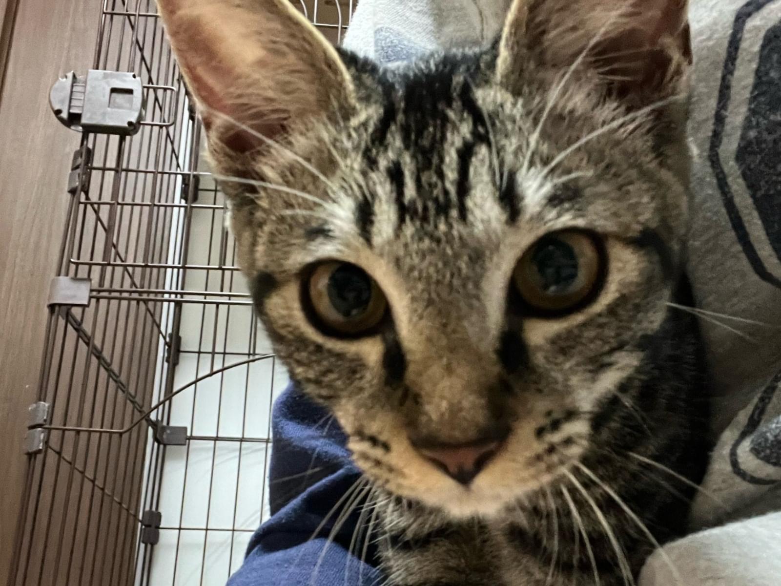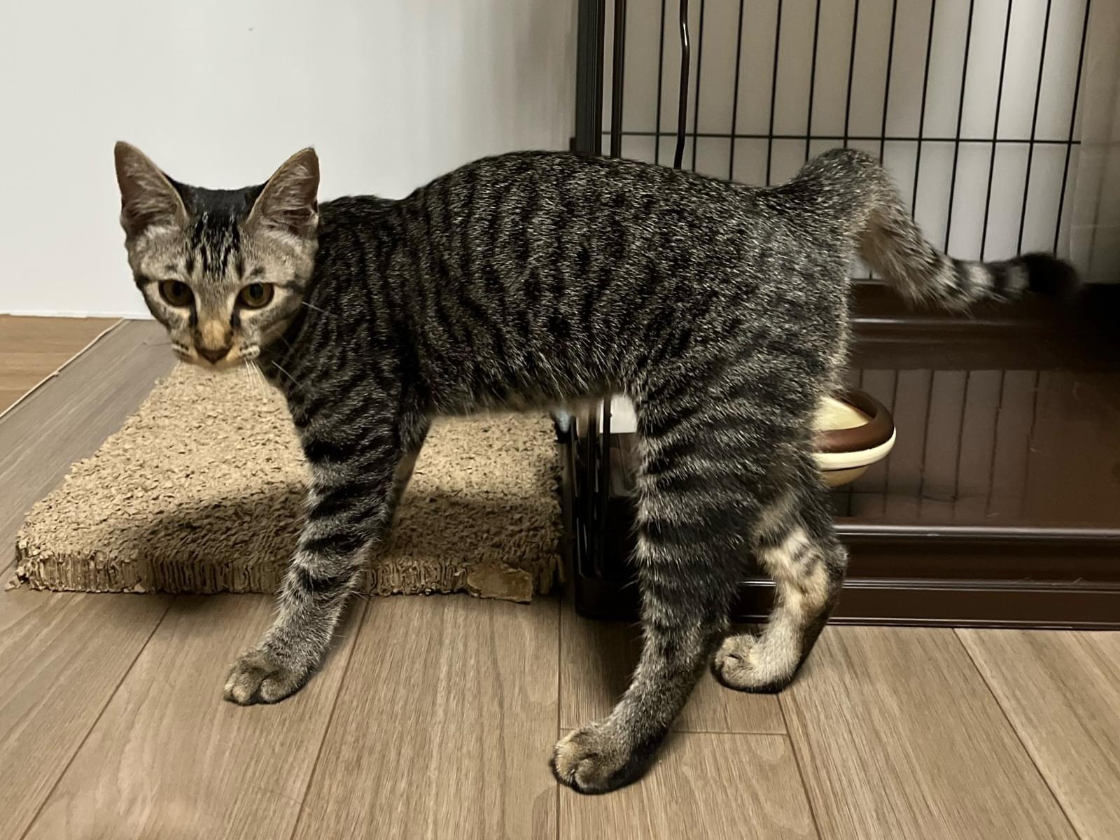 黒が多いキジトラの子猫。人に慣れていなくて臆病です。