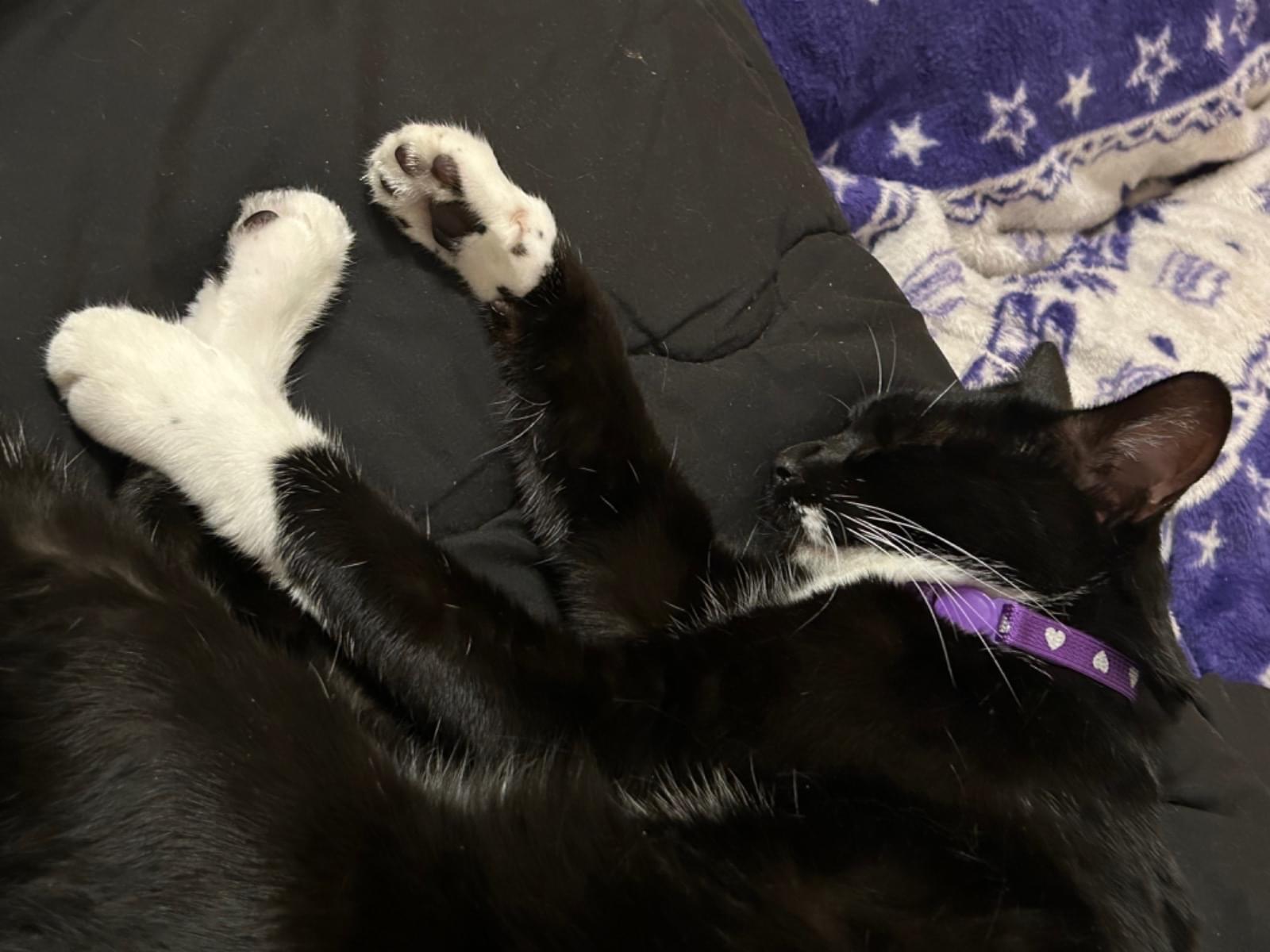 紫のハート柄の首輪、しっぽ短めのかぎしっぽ、ハチワレ(黒多め)