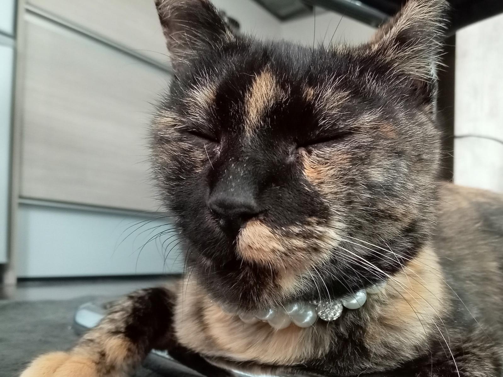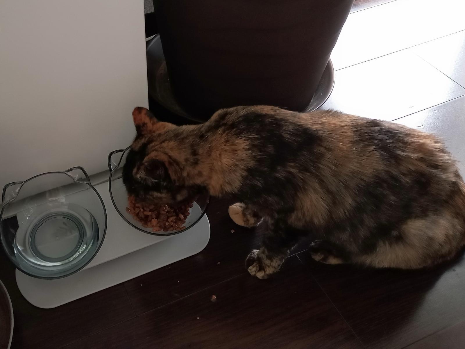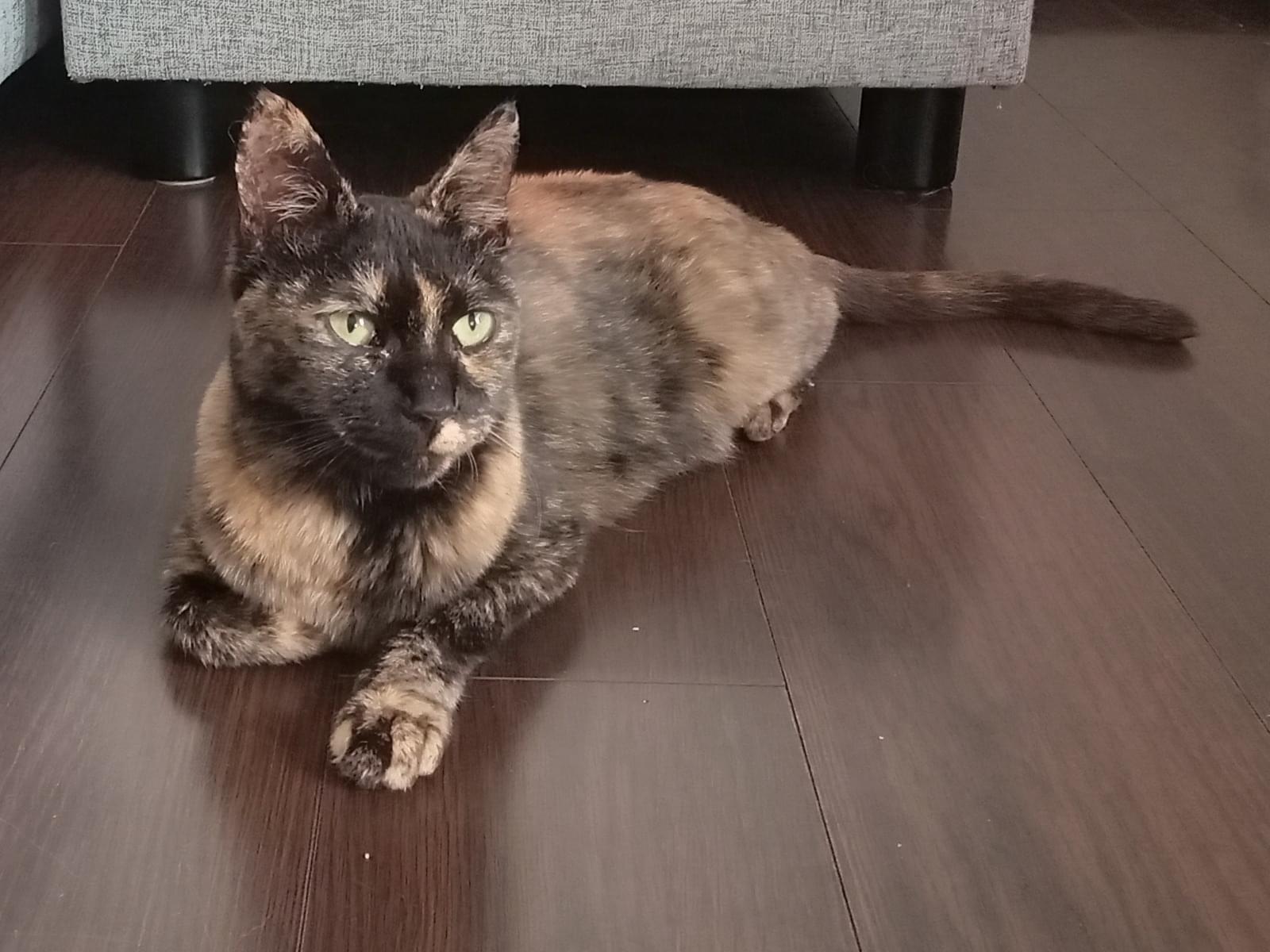 ふせいし動物病院から南方向に走って逃げてしまいました。逃げた2週間前から飼いだした元野良猫です。元野良猫ですが、人懐っこい性格です。サビ柄の女の子です。首輪は、逃げる際にのいてしまいました。