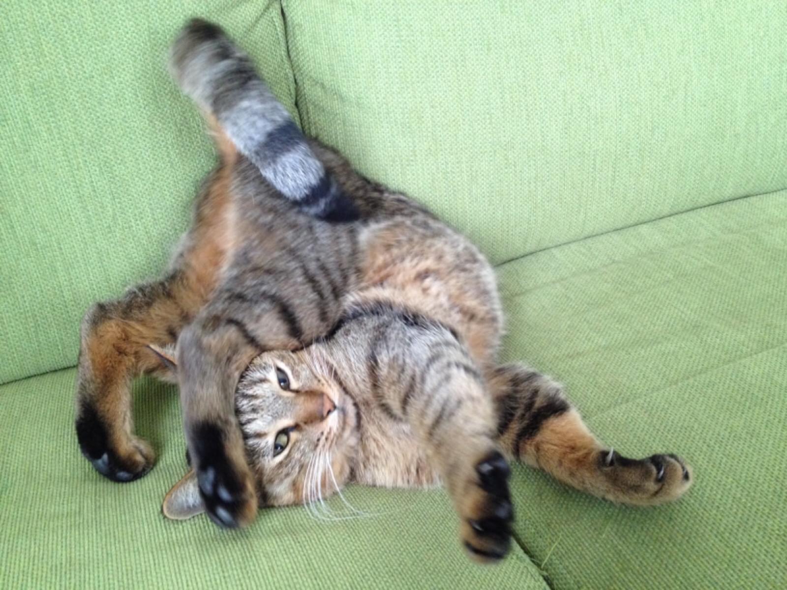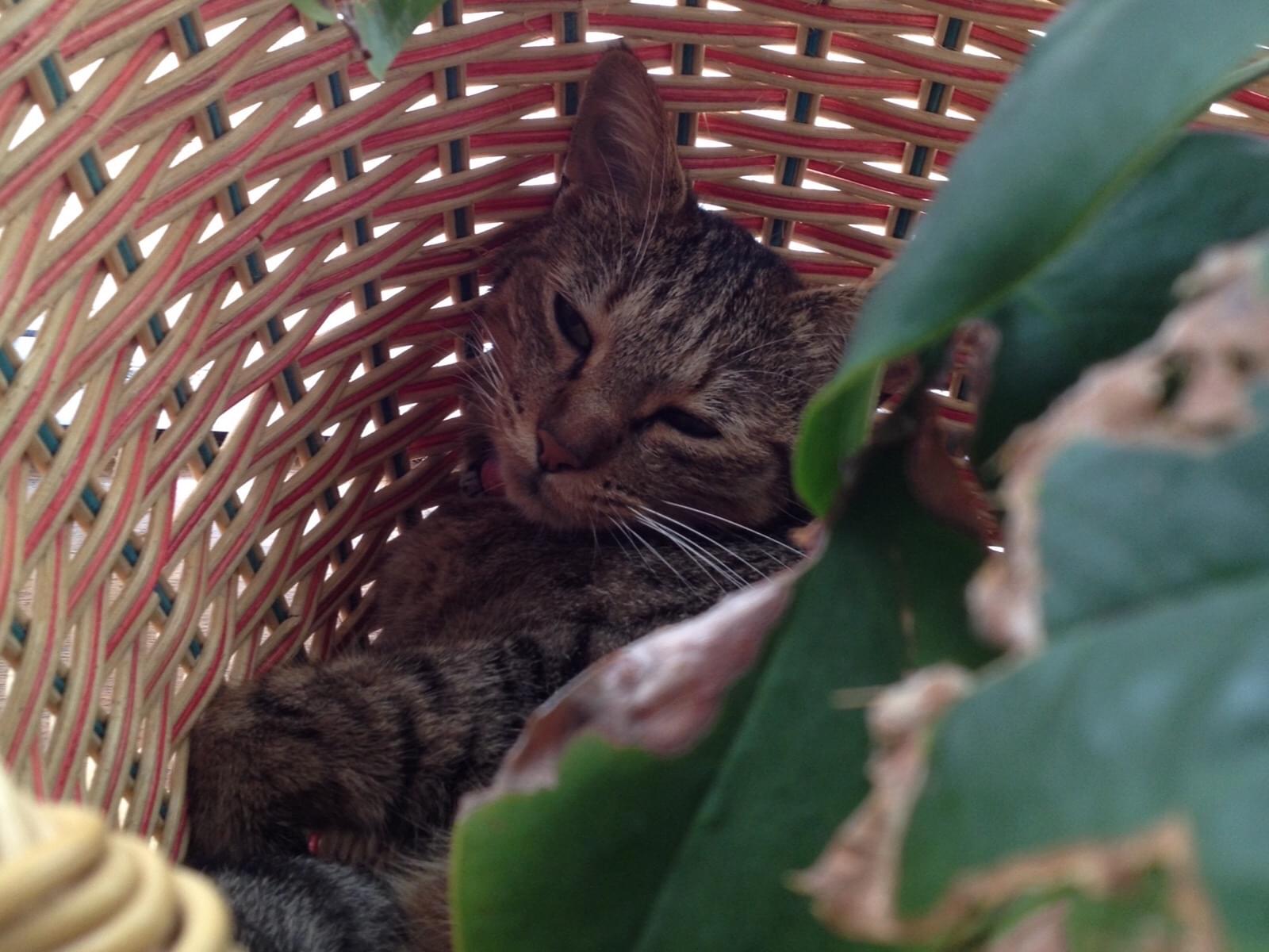 小柄で、黄色の瞳。赤いリボン飾りの付いた青地チェックの首輪をしていました。