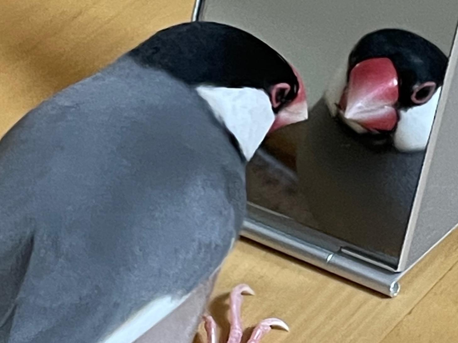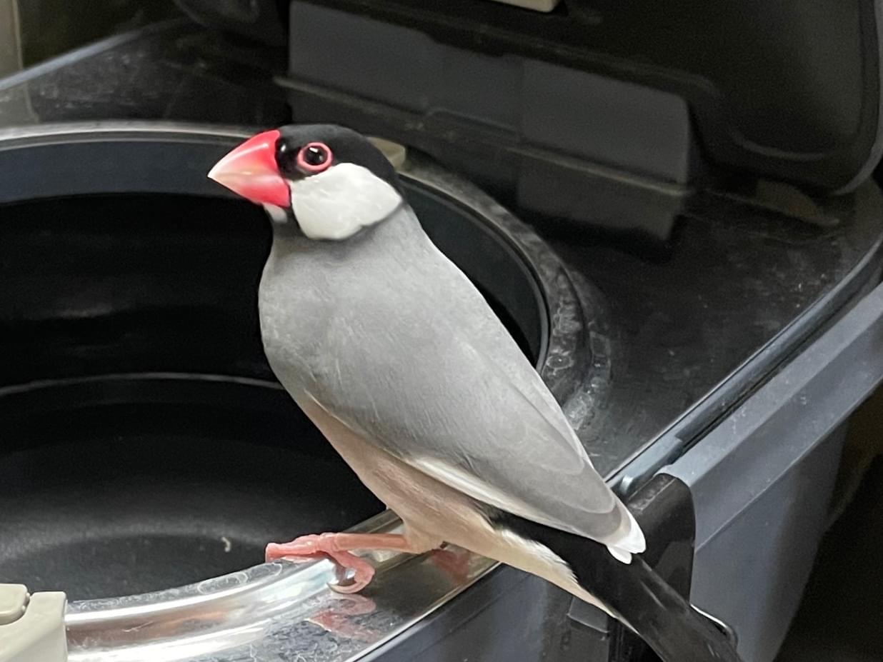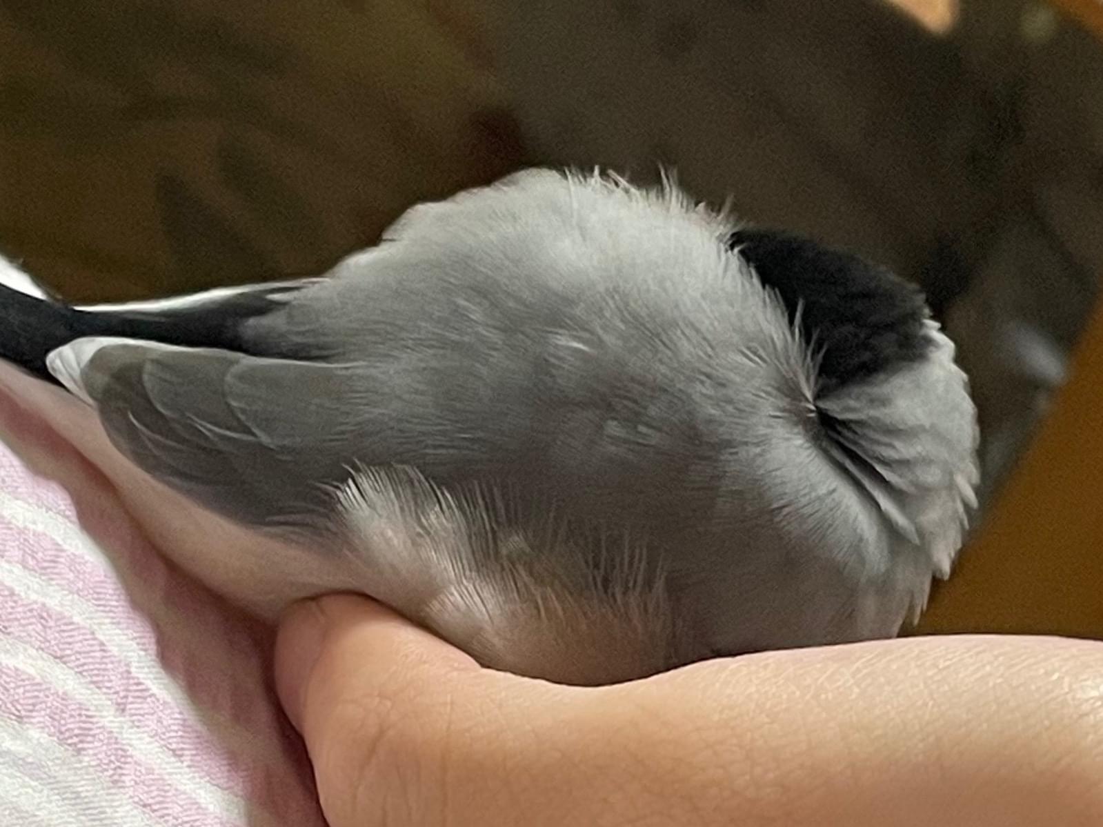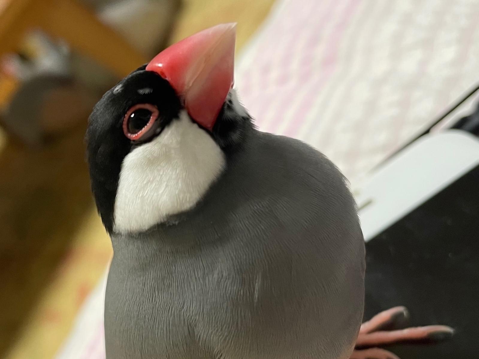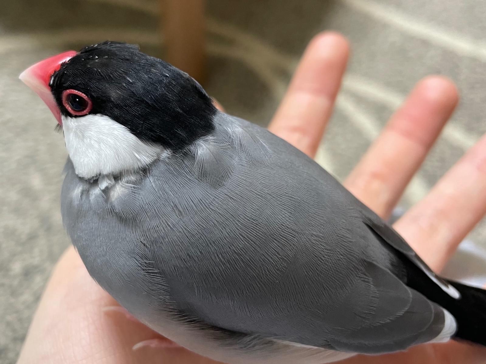 頭の上が少しだけ白い桜文鳥です。ほっぺは真っ白、羽は灰色です。声がとても大きく、ピッピというよりもぴょぴょぴょ!!とよく鳴きます。人によく慣れていますが、家族以外には気が強くよく噛む子です。