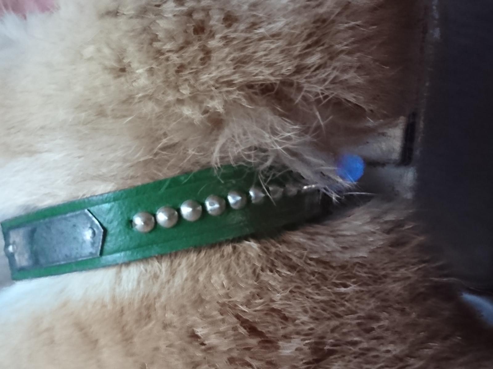 緑色の首輪。豆柴