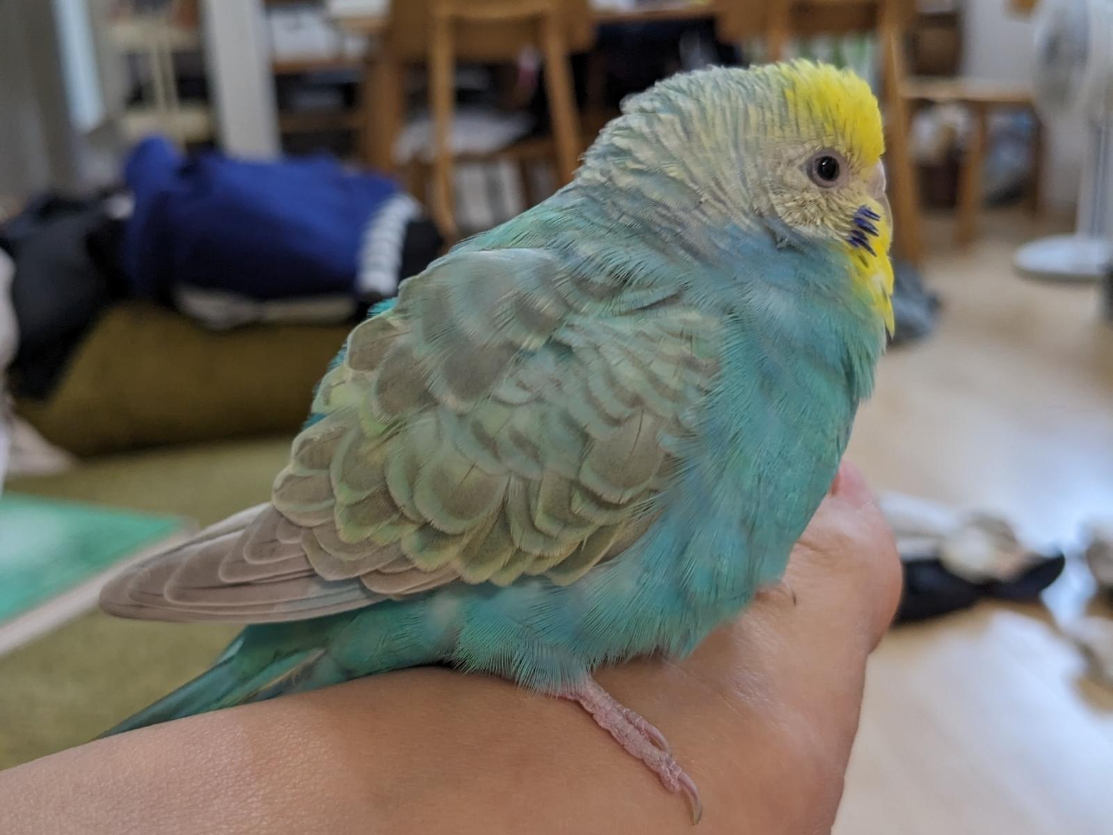 頭は薄い黄色、お腹は水色、背中は黄色、水色、グレーです。