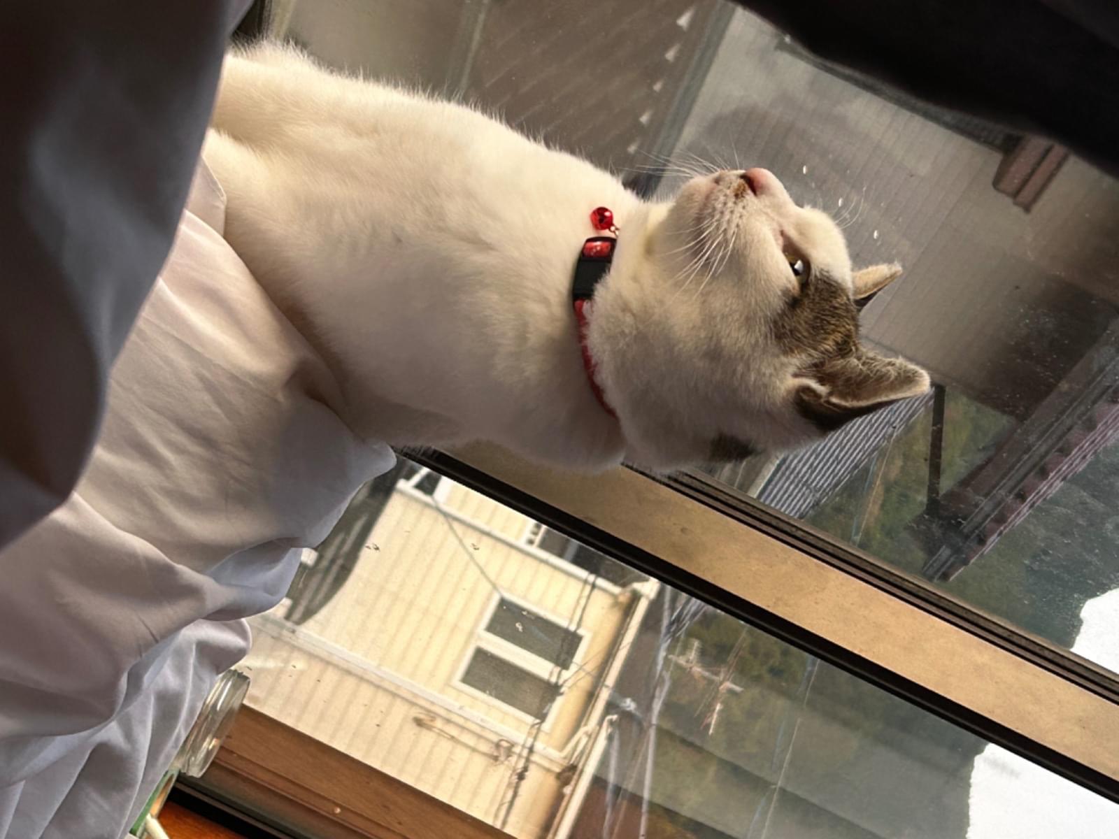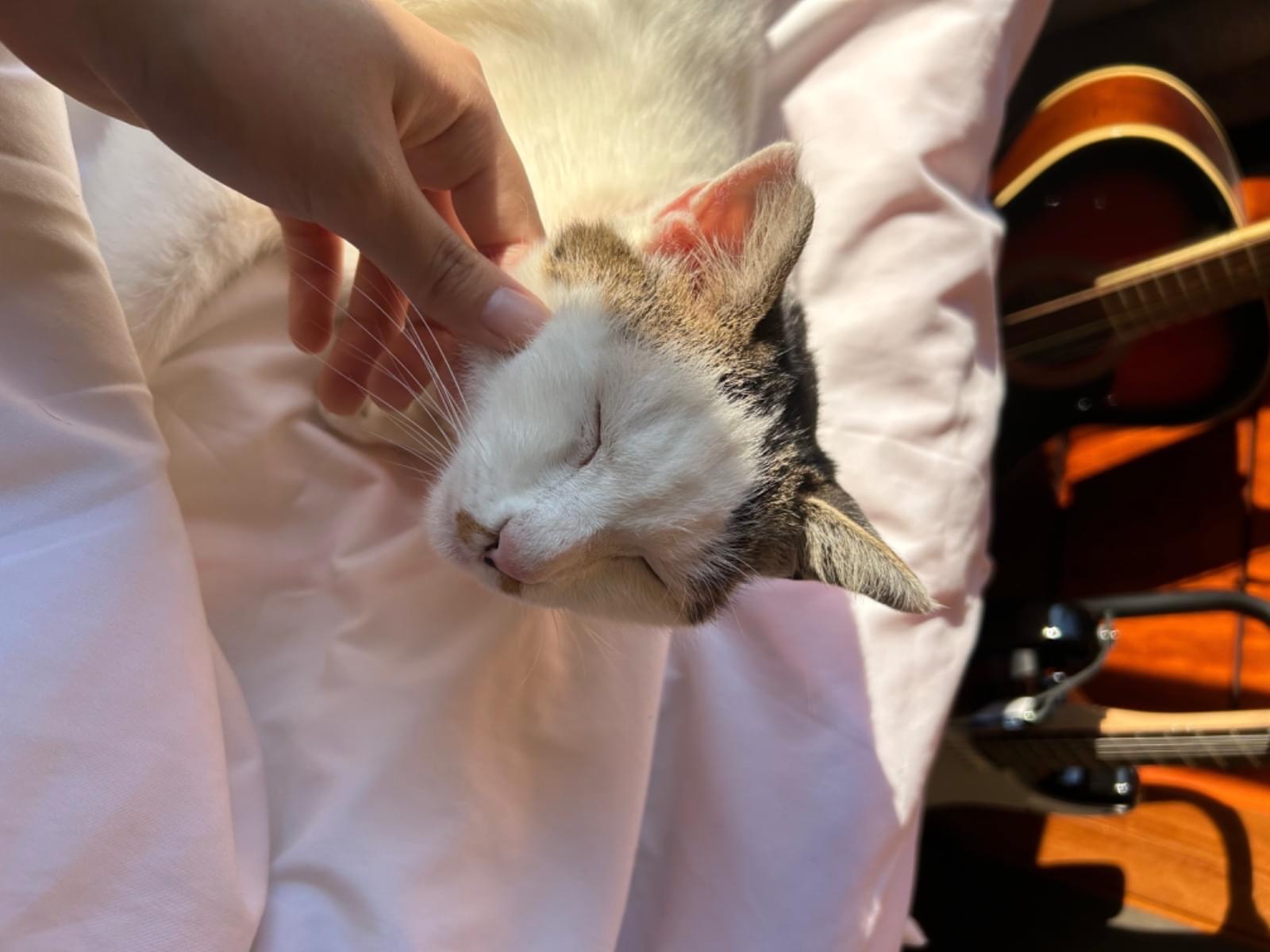元野良猫だったため、耳がカットされており、魚柄の鈴のついた赤い首輪を付けています。