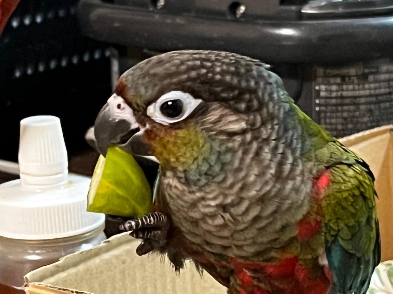 11月3日午前9時頃、放鳥中にうっかり戸を開けて、アカハラウロコインコの弁慶(べんけい)が逃げ出しました。背中は深い青緑色で、羽の内側とお腹は赤です。密林の中から聞こえそうな「ギョギョギョン」「ギエーッ」という声をよく出します。よく人に懐いていて、「おいで」で頭や肩に乗ってきます。「元気ー?」など声掛けすると高速でウンウンウンウンと頷くことがあります。果物が好きで、見るとすぐに寄ってきて大体なんでも食べます。