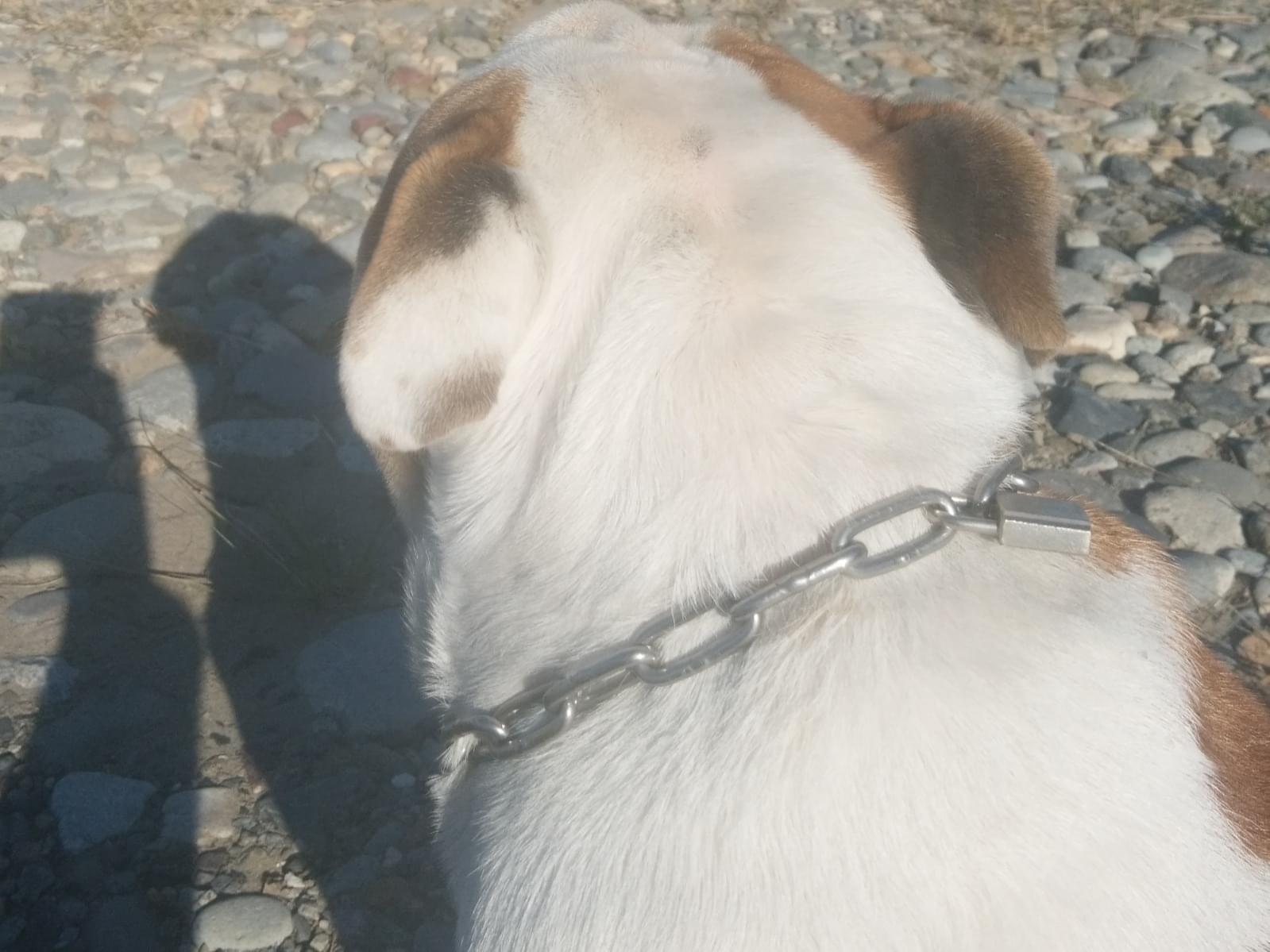 茶色に白ステンレスの鎖にシルバーの鍵🔒の首輪をしています。