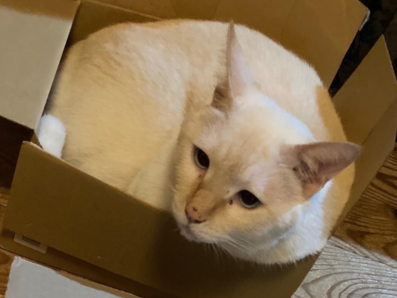 大柄な白猫で頭と尻尾に薄い茶色い縞があります。