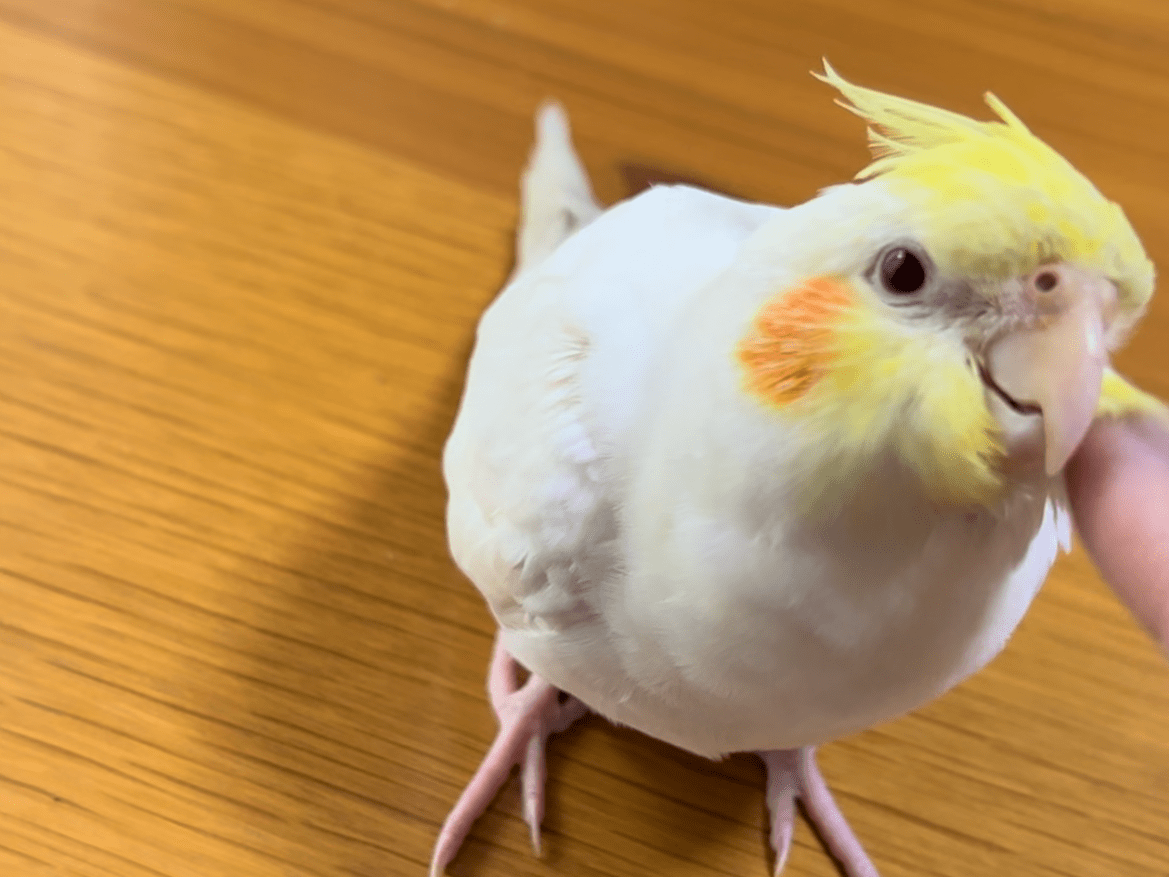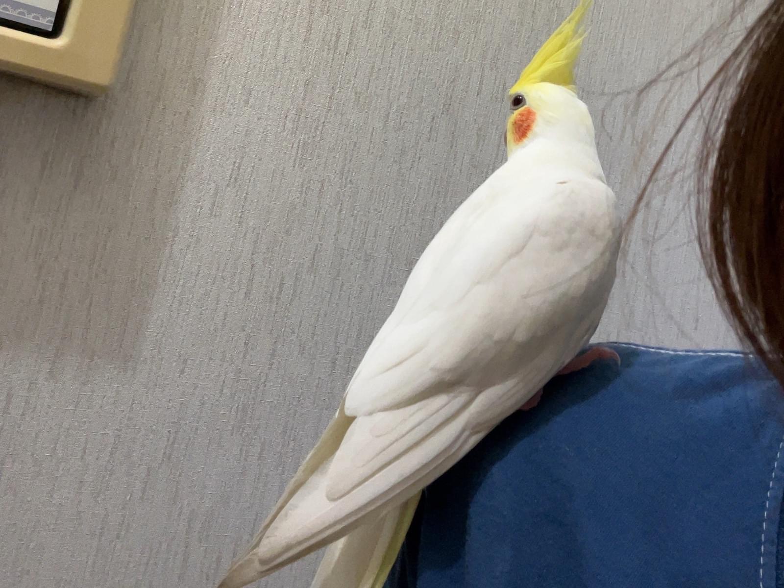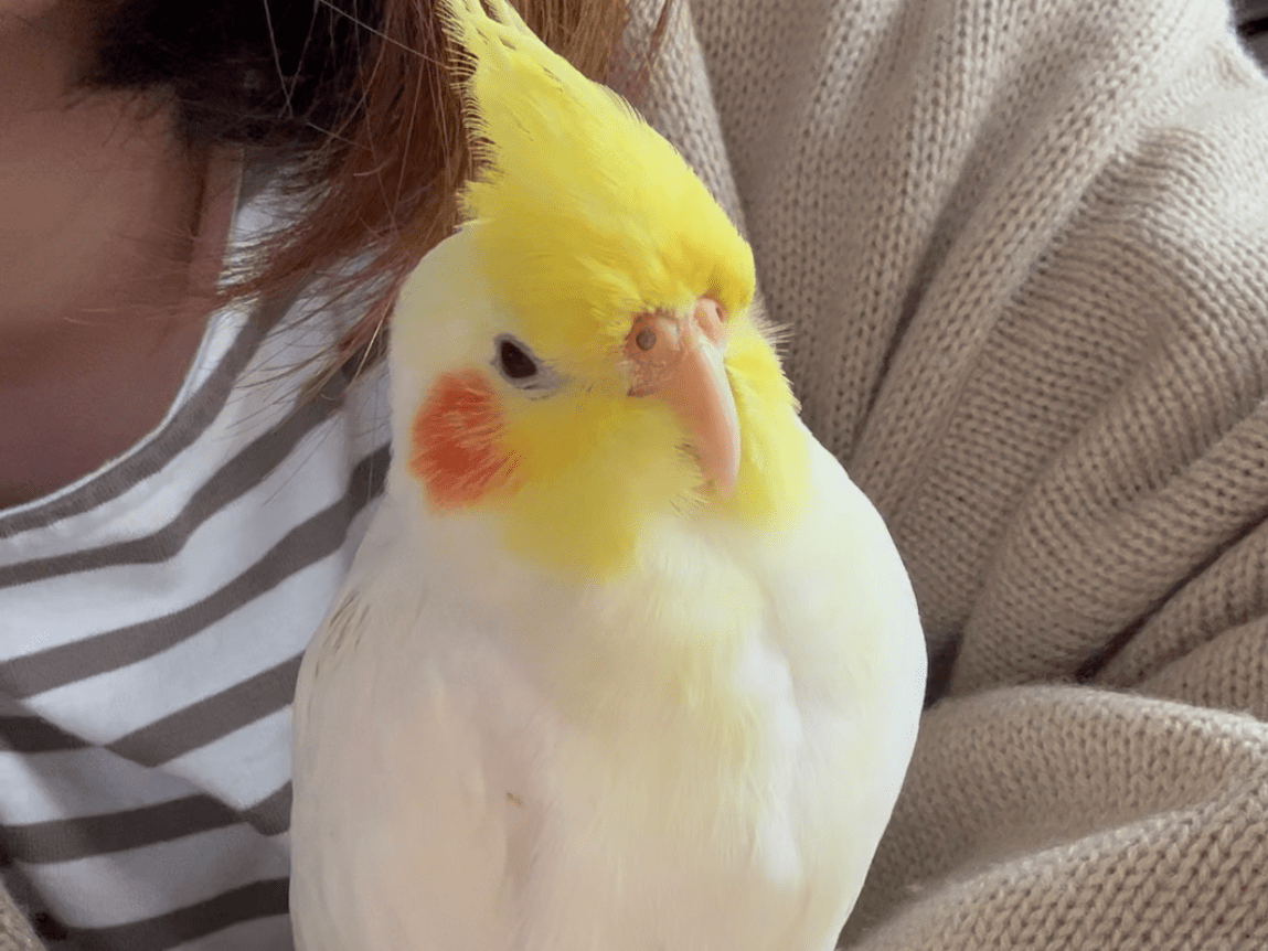 体は白色、顔は黄色、頬がオレンジのオカメインコを探しています。