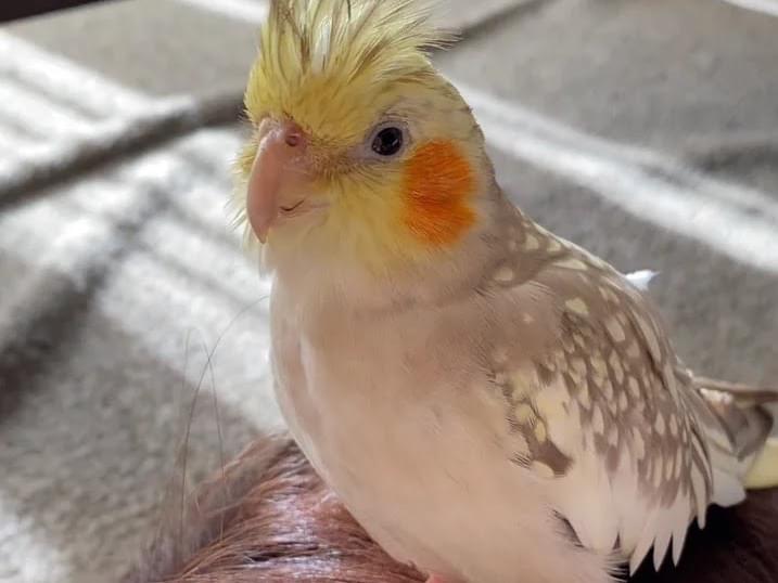 種類はシナモンパールです。頭が黄色、体は薄いグレーで白い丸があります。右目の上にぽつっとしたできもののようなものがあります。冠羽はあまりなくしょろしょろです。