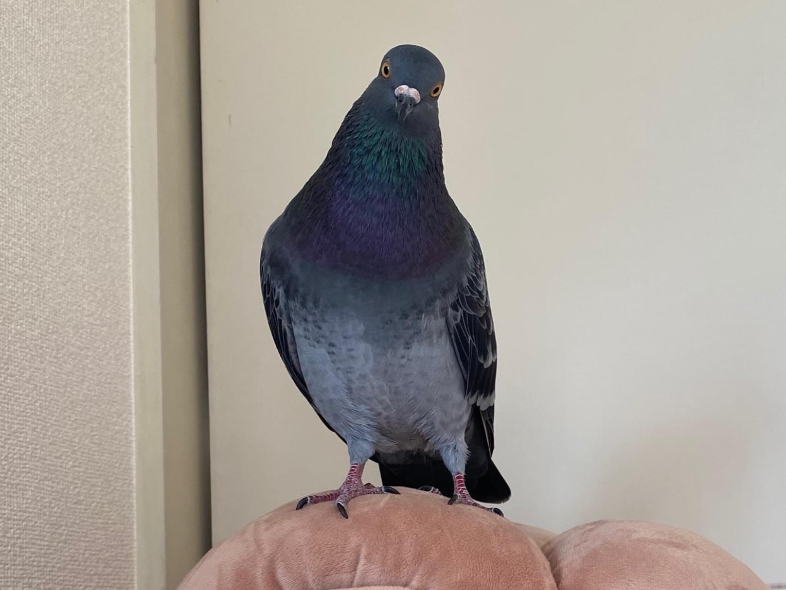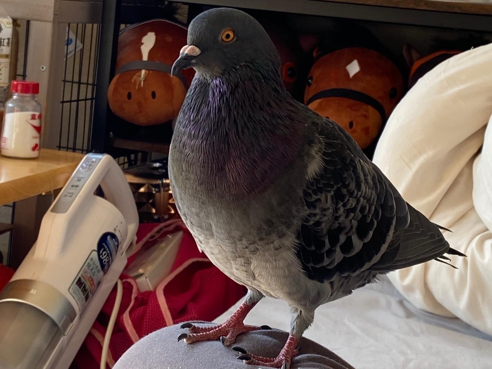 保護鳩 よく見ると胸元がドット柄 羽はまばらに白とグレーと黒
