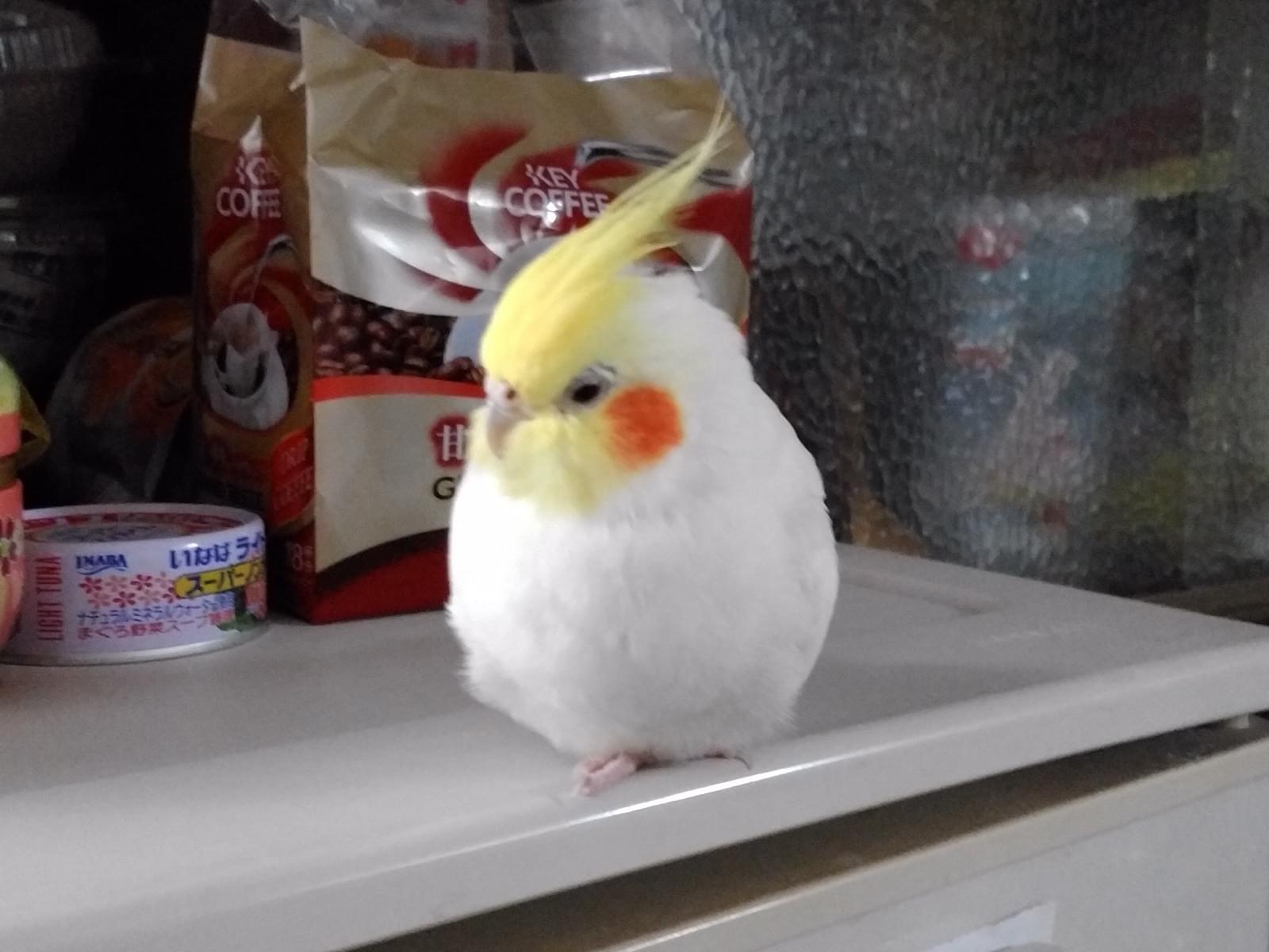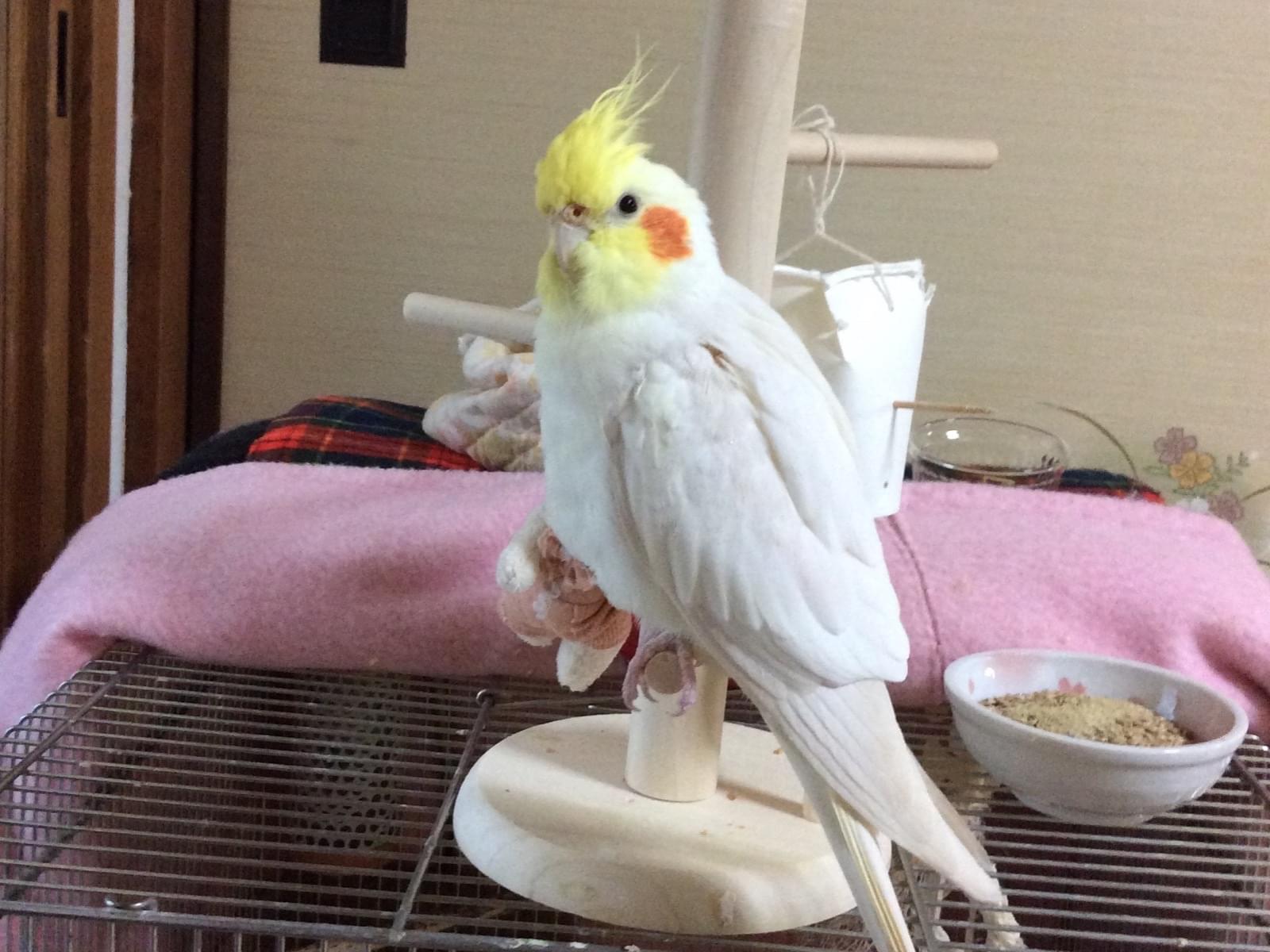 色は頭と冠羽が黄色、ほっぺはオレンジ、身体は白く背中はうっすらとベージュがかっています。冠羽を立てるとハゲているところが見えます。