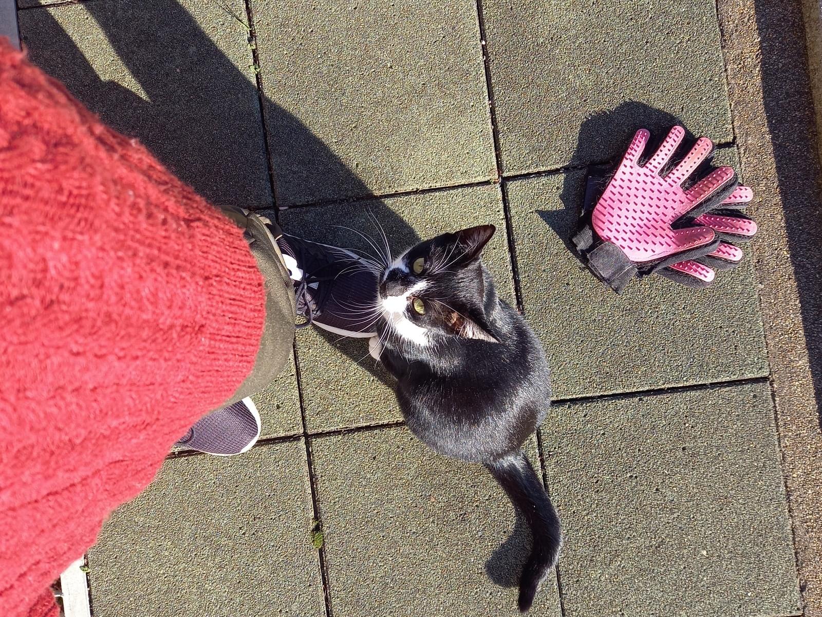 左前足に大きな怪我をしている黒にホワイトソックスの女の子です。