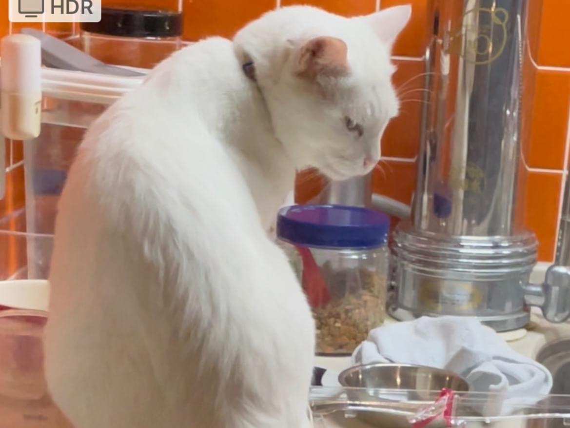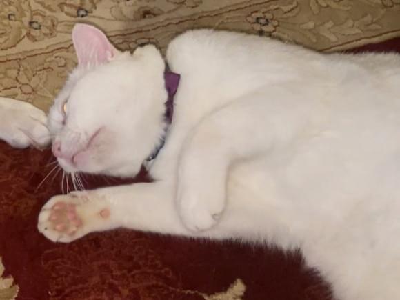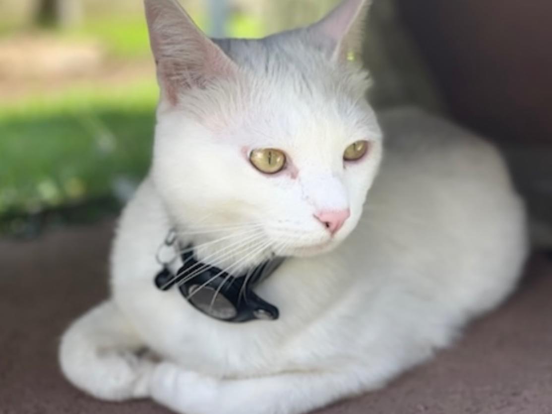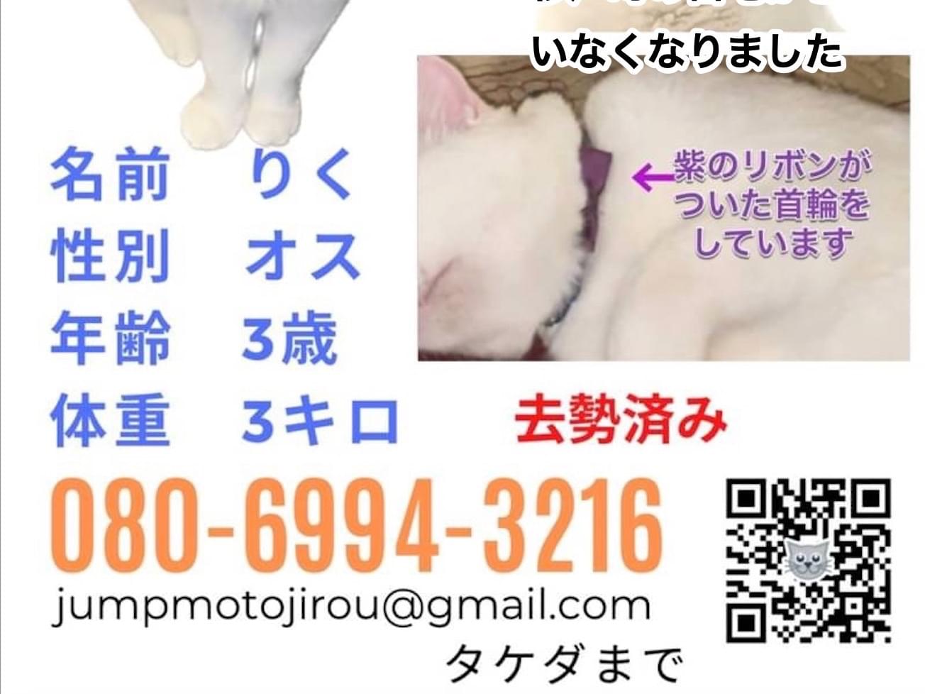 白猫のリクを探しています!紫のリボンがついた首輪をしています