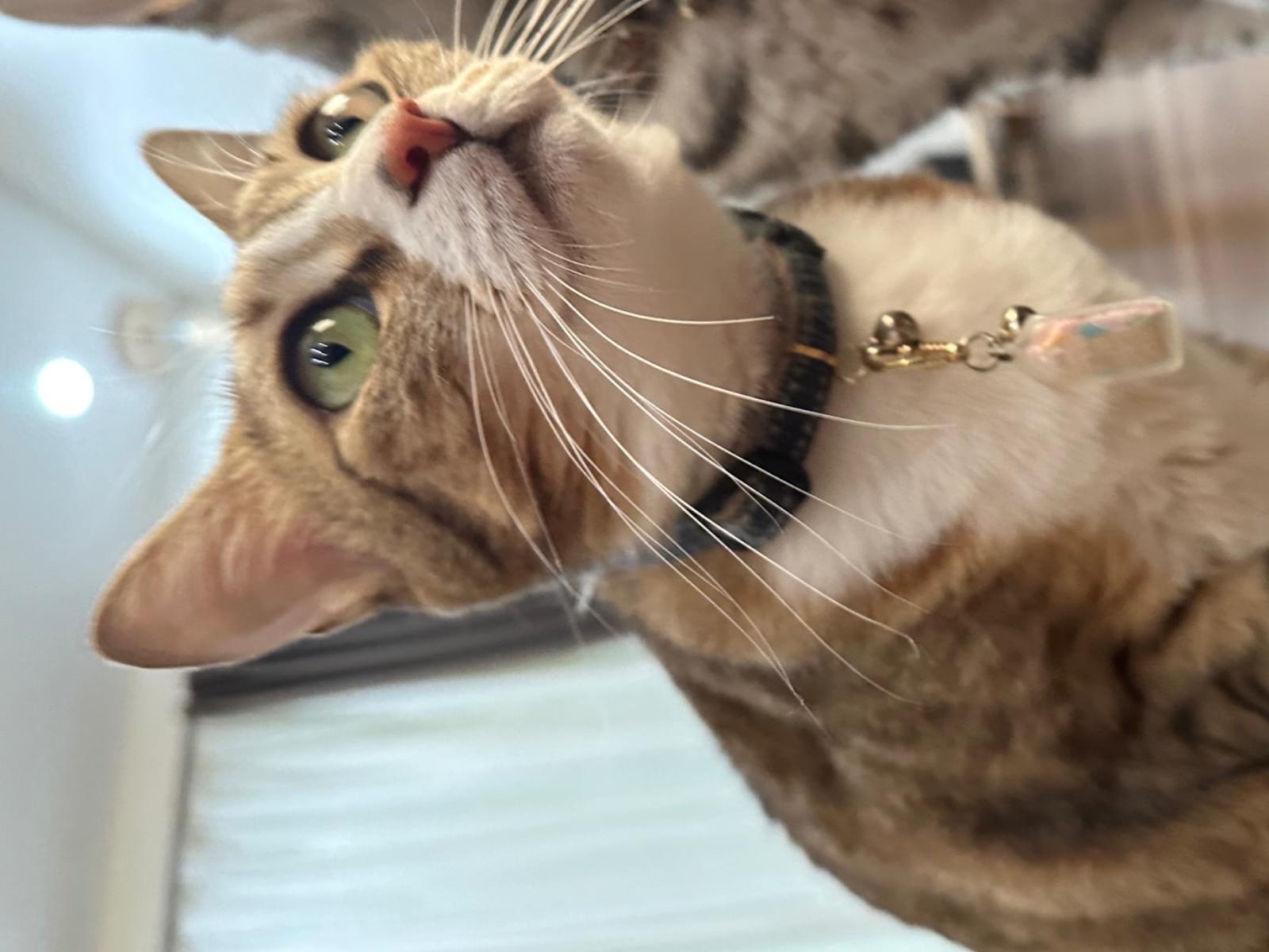 薄い茶色の虎模様で、お腹と手足先は白色のネコです。首輪は水色のバンダナがついていて、西条神社のピンクのお守りが首下についています。