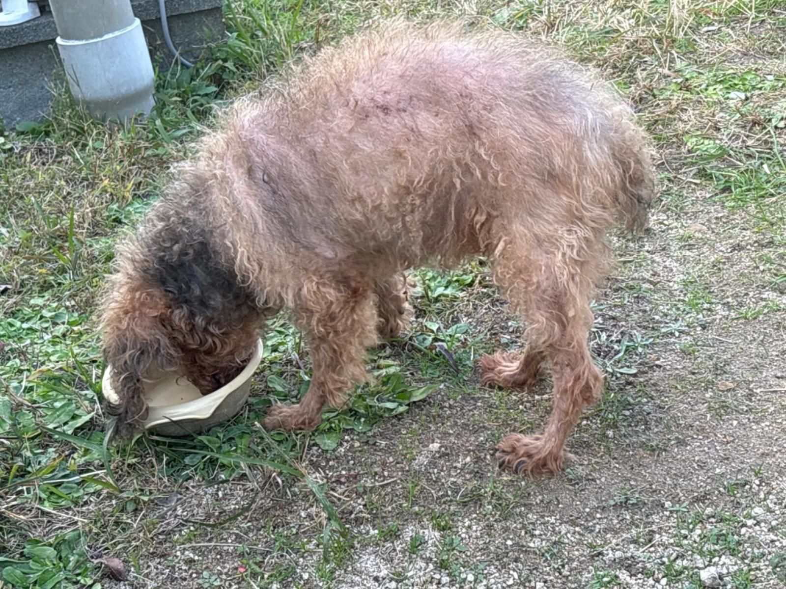 茶色のトイプードルと見られるわんちゃんです。首輪等は何もないです。