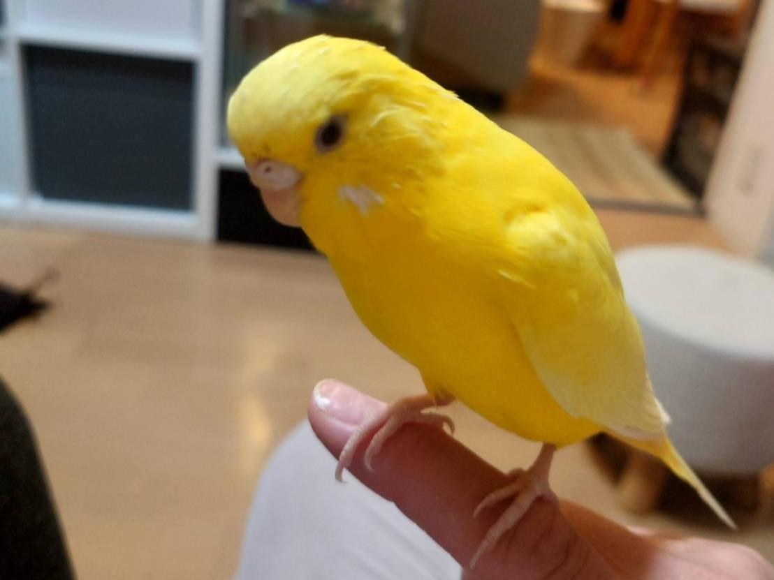 頬の一部と尻尾や羽根の先が白い以外はほぼ全身黄色いセキセイインコです。