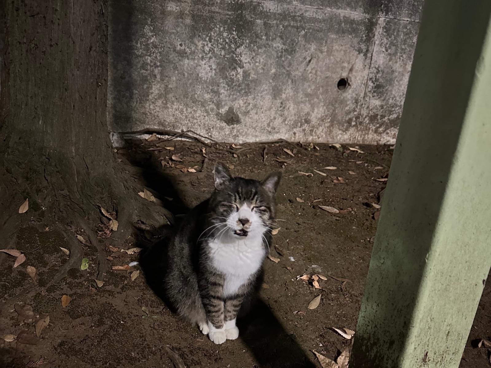 公園内の端っこにいて、近づいたら何かをうったえるように鳴いていました。近くまでくるけど触られるのは嫌みたい、指先の匂い嗅いだらそこに座り込む。でも離れようとすると鳴きながらついてきます。