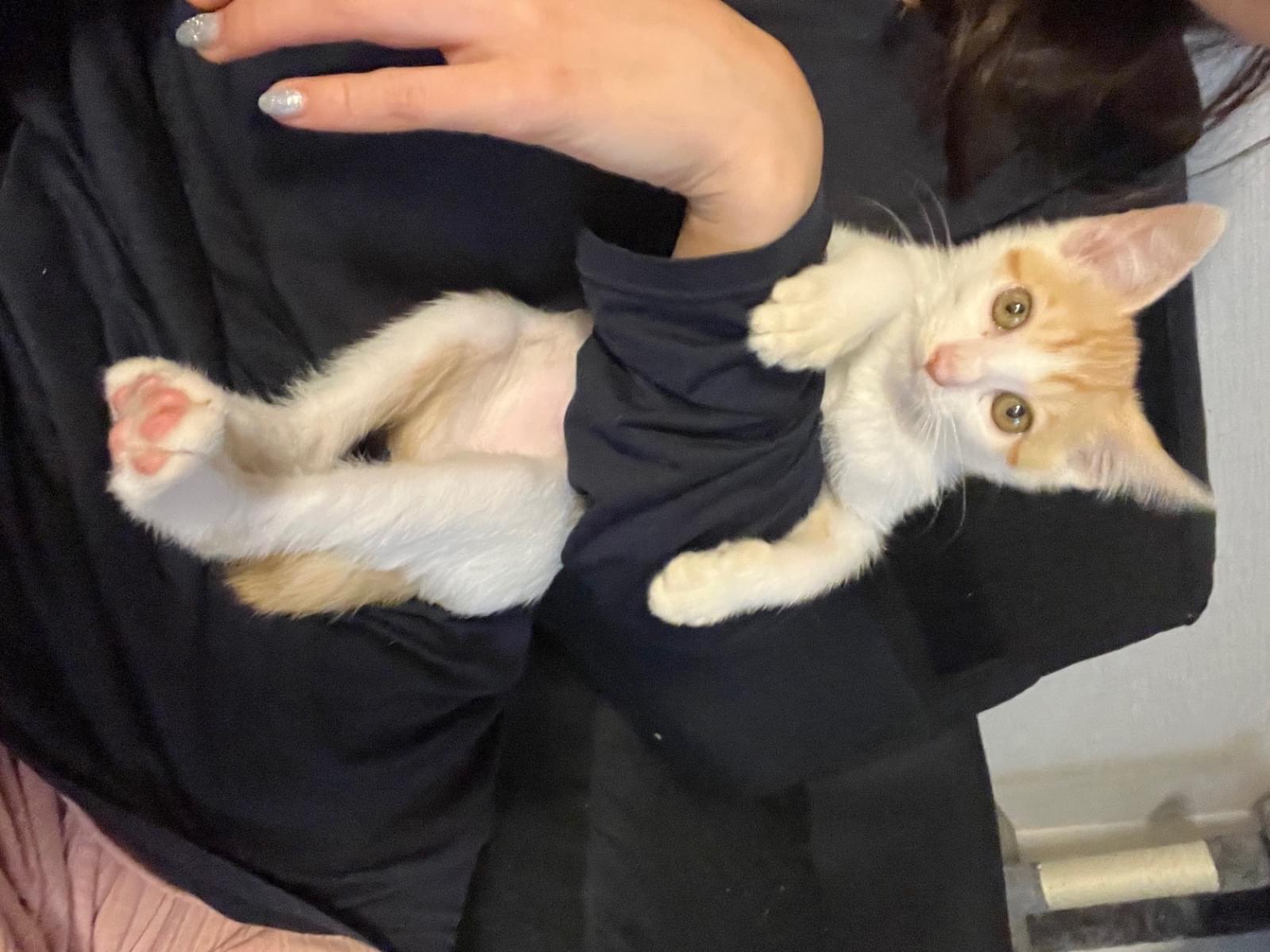 白と茶色の柄がある、小柄で人懐こく、尻尾が茶色でくるっと折れているのが特徴的です。