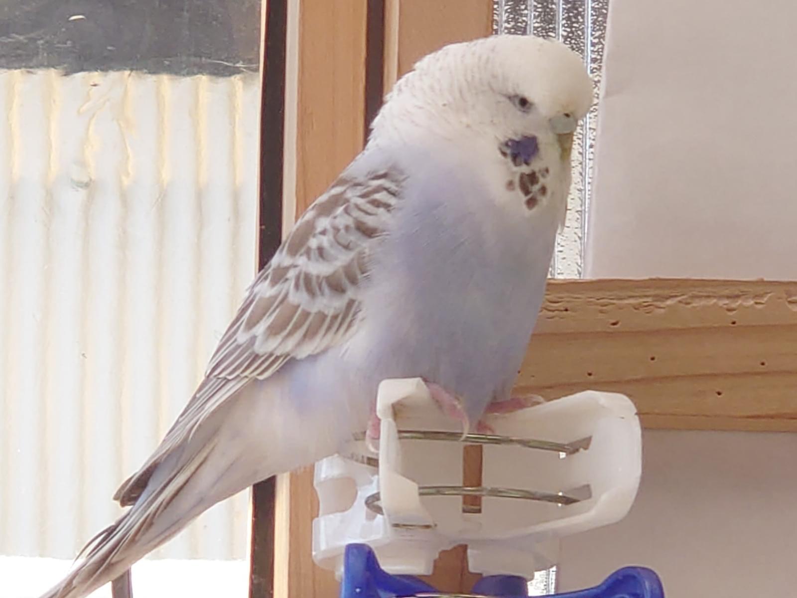 ジャンボセキセイインコの女の子ですが、体長はジャンボにしては少し小さめで、頭から尻尾の先までで20センチ程度です。体毛は白、水色系ですが光の加減によっては薄い紫系にも見えます。