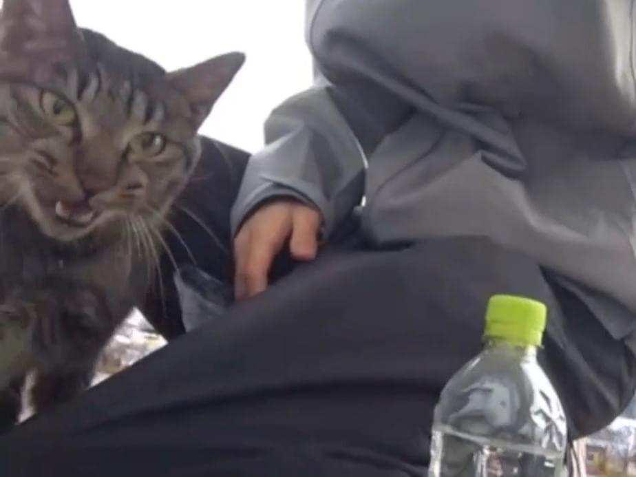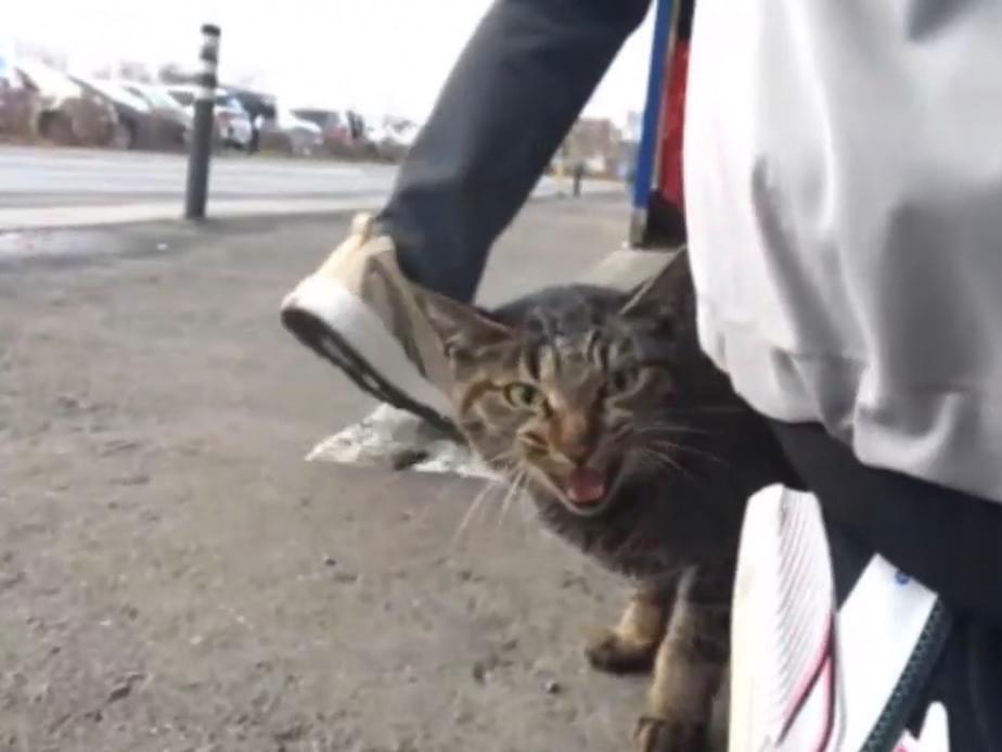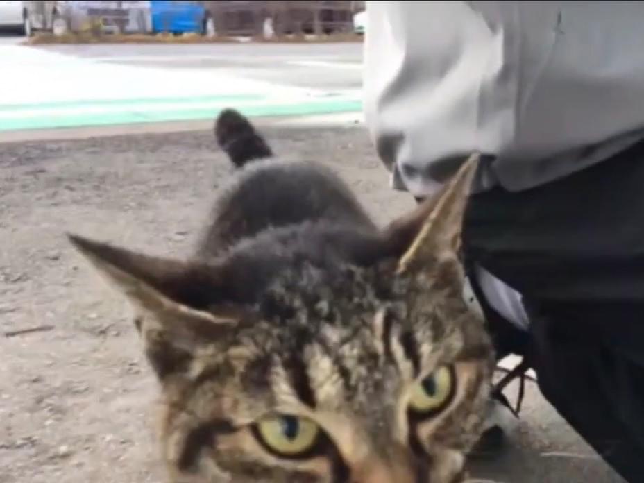 キジトラの迷子猫が寒そうにしていた。黒・茶色・縞模様、目は黄色、人懐っこい