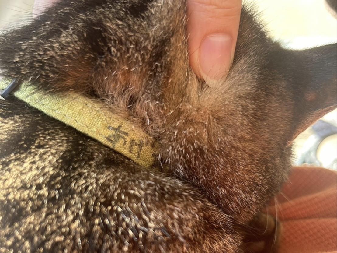 キジトラ オス 右桜耳 しっぽ半分 黄緑の瞳 黄緑の首輪(裏に電話番号)