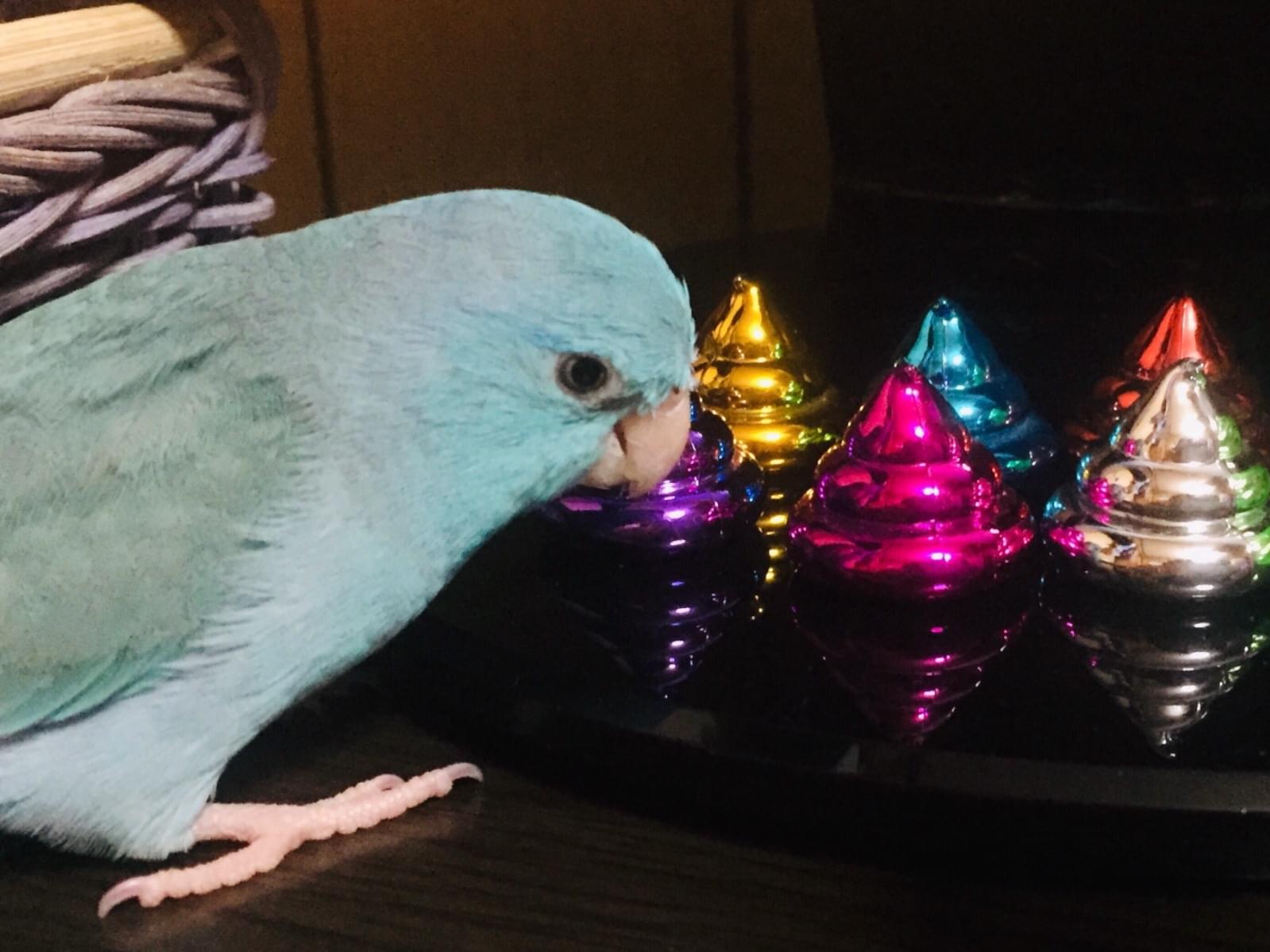 身体は少し緑の入った青です。ビニールの音などによく反応していました。喋ることはないです。
