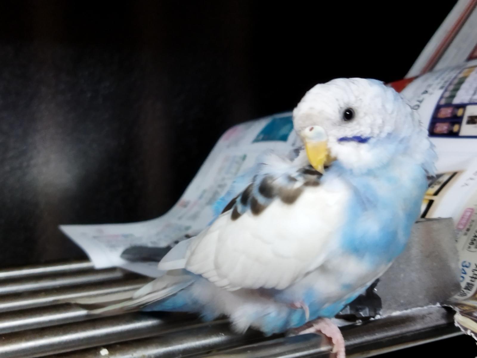 白と青のミックス模様で背中に黒の柄が少し入っているセキセイインコです。