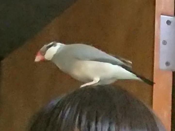 頭が白と黒の霜降り模様で、人に慣れているので肩や手、頭に乗って来ます。