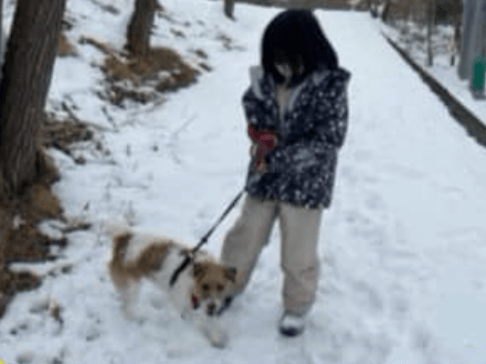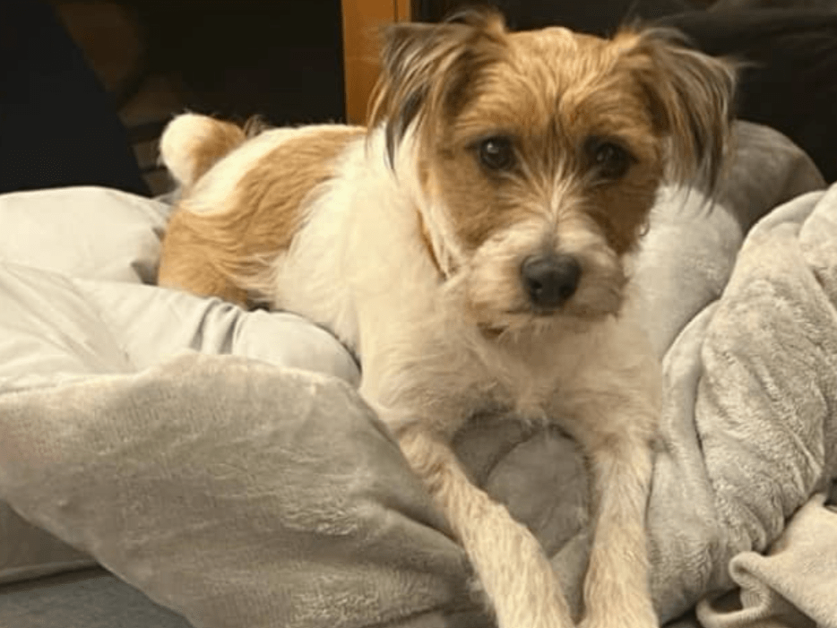 赤い首輪(リボン付き)をしています。垂れ耳で、耳に飾り毛があります。体の左側にハート型にみえる茶色い模様があります。毛の種類はブロークン(やや長め)。ジャックラッセルテリア のわりに足が長いです。