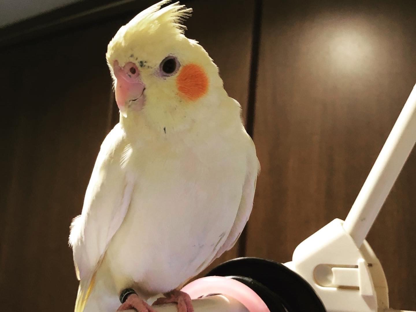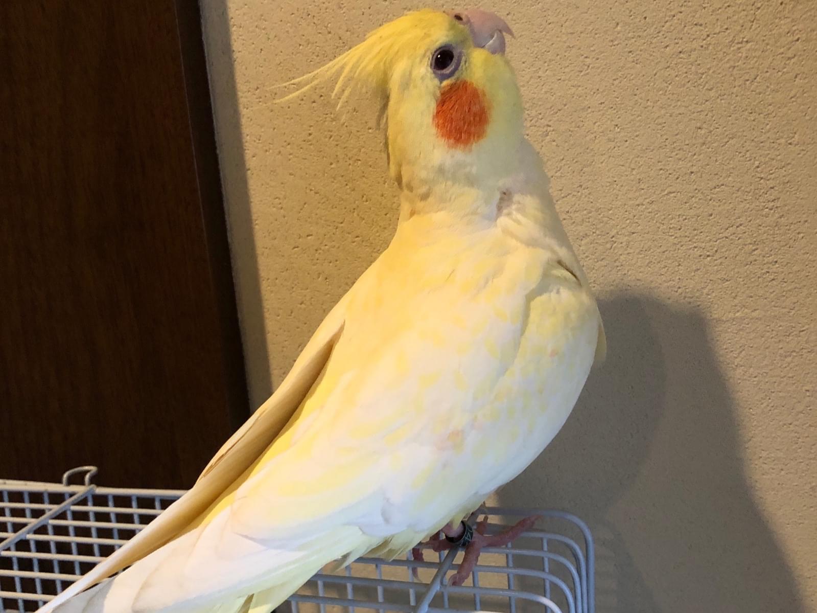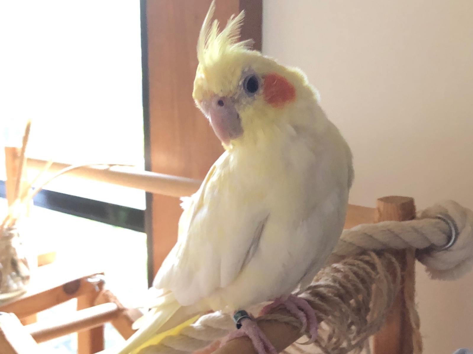 黄色にオレンジほっぺ、右足首に緑色リング。慣れると頭に乗ります。