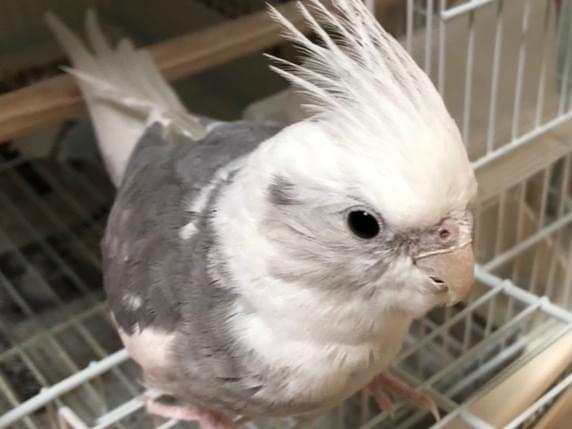 顔が白、背中が暗い灰色のオカメインコ を探しています。